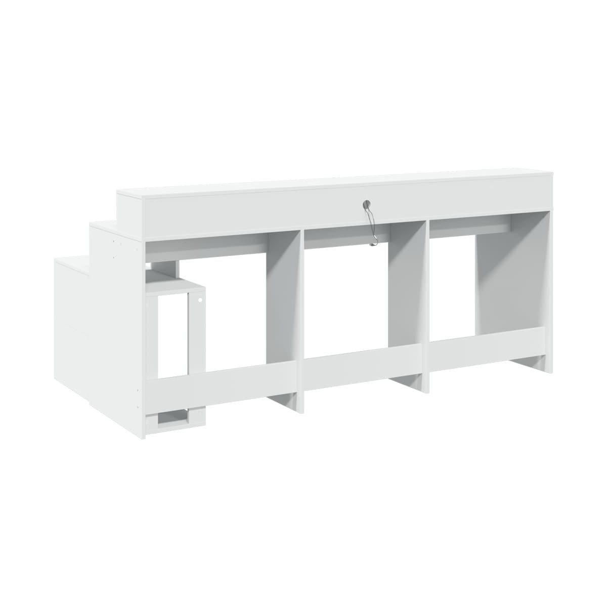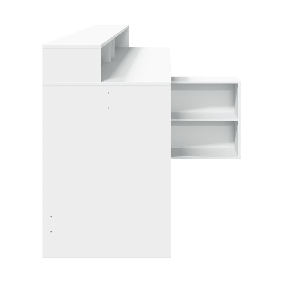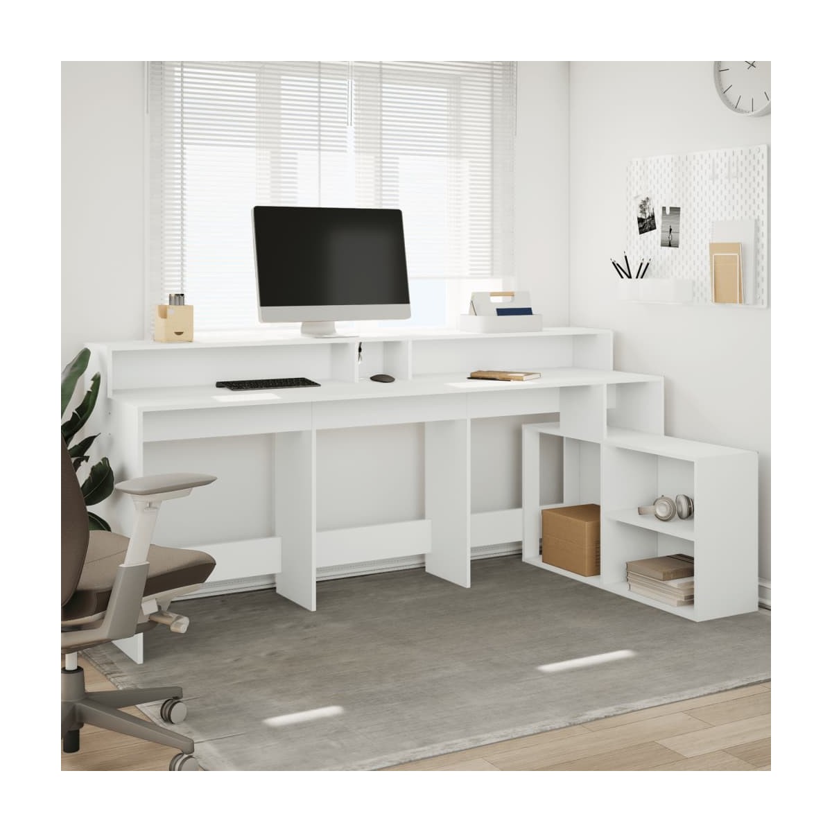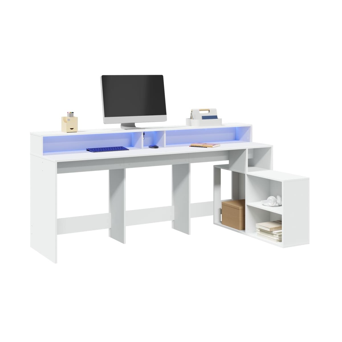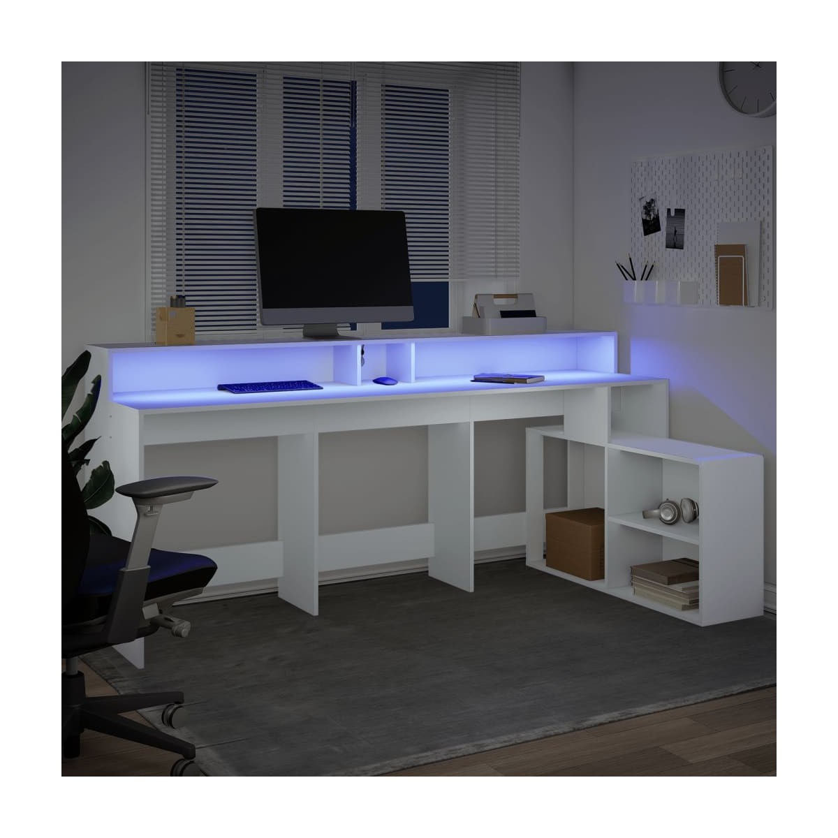 Con un amplio espacio de almacenamiento, una construcción duradera y opciones de iluminación LED, este escritorio es perfecto para crear un espacio de trabajo o de juego organizado y elegante. Material estable y duradero: La madera de ingeniería es un material duradero y estable con una superficie lisa que es resistente a la humedad, la deformación y la rotura, lo que la convierte en una opción fiable para varios proyectos.Luces LED RGB para un ambiente agradable: Este escritorio cuenta con luces LED que se pueden ajustar fácilmente para crear un espectáculo de luces personalizado. Puedes personalizar los modos, los colores y el brillo para mejorar el ambiente de tu espacio interior.Amplio espacio de almacenamiento: El escritorio incluye compartimentos y estantes abiertos, lo que ofrece amplias opciones de almacenamiento para todos los elementos esenciales de su oficina y ayuda a mantener tu espacio de trabajo organizado y ordenado. Además, el escritorio LED cuenta con un orificio especial para la administración de cables, lo que garantiza que tu escritorio se mantenga ordenado.Fácil mantenimiento: Gracias a su superficie lisa, el escritorio con LED es fácil de limpiar con un paño seco y suave y requiere menos mantenimiento. Desconecta el producto de la fuente de alimentación o apaga la fuente de alimentación cuando no esté en uso y cuando la limpies. Advertencia:Para evitar que vuelque, este producto debe usarse con el dispositivo de fijación a la pared suministrado. Información útil:Los tornillos y los tacos para el interior de la pared no están incluidos. Te recomendamos buscar y utilizar tornillos y tacos adecuados específicamente para tus paredes. Si no estás seguro, puedes consultar con un profesional. Lee y sigue cada paso de las instrucciones.El producto tiene un conector USB que necesita una fuente de alimentación USB certificada de 5 V (no incluida).
