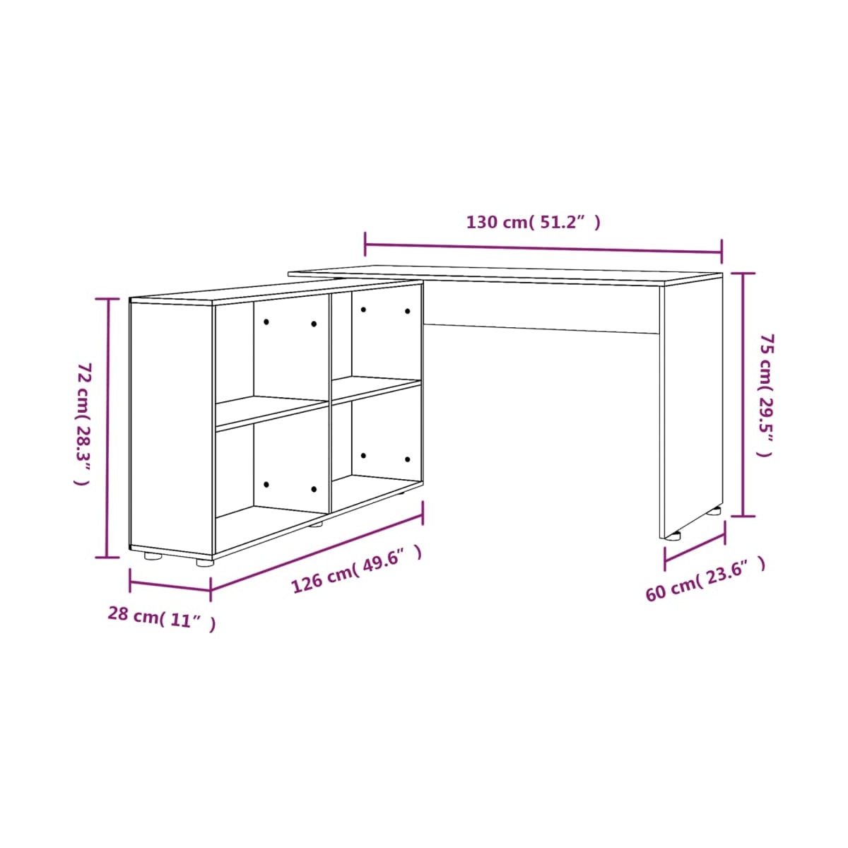 - Dimensiones del escritorio: 130 x 60 x 75 cm (largo x ancho x alto)