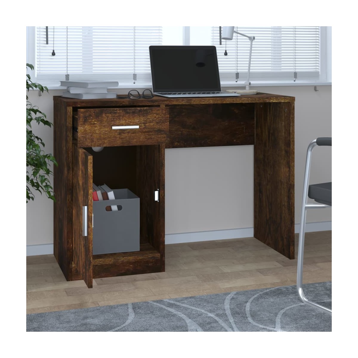 Este elegante a la par que sencillo escritorio, con un cajón y un armario, será un aporte práctico para cualquier casa u oficina. Material duradero: La madera contrachapada tiene una calidad excepcional, con una superficie lisa y también cuenta con fuerza, estabilidad y resistencia a la humedad.Amplio espacio de almacenaje: Este escritorio de oficina cuenta con un cajón y un armario para ofrecer un amplio espacio donde tener las cosas organizadas y al alcance.Práctica puerta: Mantén tus objetos esenciales sin polvo al esconderlos detrás de la puerta de este escritorio de ordenador. Nota:Cada producto viene con un manual de montaje en la caja para facilitar el montaje. Advertencia:Para evitar el vuelco, este producto debe usarse con el dispositivo provisto para fijarlo a la pared.