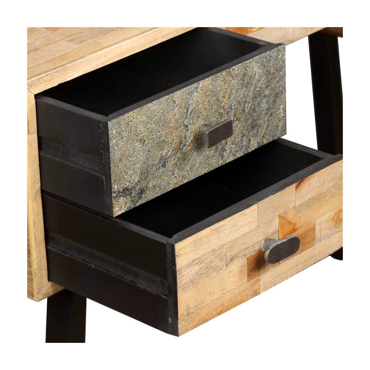 Este escritorio de estilo vintage será un accesorio atemporal para su estudio, oficina o salón. El escritorio está hecho de teca reciclada, que es sólida, estable, duradera y bonita. En sus cuatro espaciosos cajones, puede guardar diversos objetos, como libros, libretas, bolígrafos y otros cachivaches. La superficie veteada de los cajones enfatiza el estilo vintage y único del escritorio. Cada paso del proceso se lleva a cabo con el mayor de los cuidados, ya sea el diseño, el pulido o el lacado. Nota importante: Los colores y las vetas de la madera pueden variar de una pieza a otra, por lo que cada uno de nuestros escritorios es único; la entrega es aleatoria.