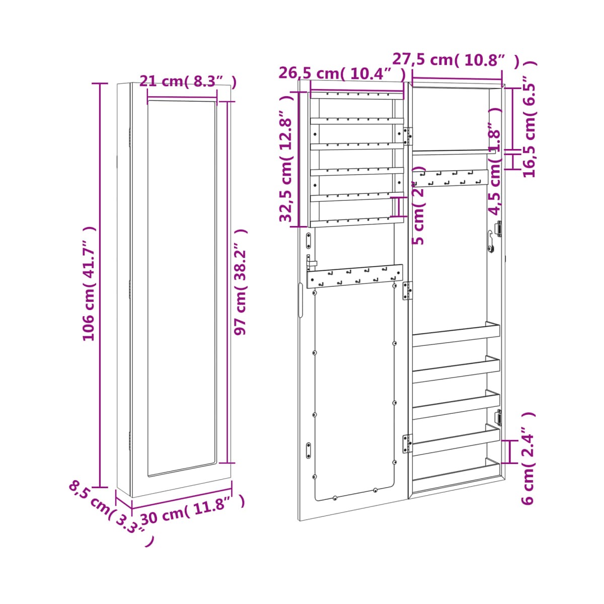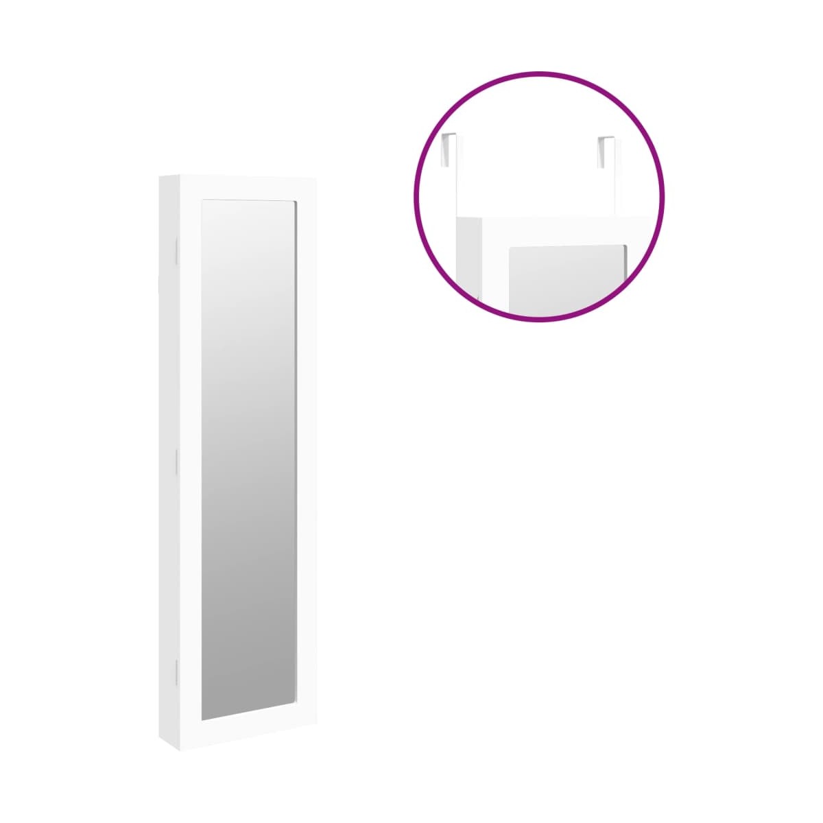 ¡Guarda las joyas y los perfumes de forma discreta y elegante con este estiloso espejo con joyero! Material duradero: La madera de ingeniería es de una calidad excepcional, con una superficie lisa, y también cuenta con fuerza, estabilidad y resistencia a la humedad. Hecho de madera de ingeniería, el joyero se limpia fácilmente con un paño húmedo. Amplio espacio de almacenaje: El espejo de almacenaje posee muchos ganchos, perchas y estantes para mantener las joyas ordenadas y al alcance de la mano.Espejo práctico: Con un espejo de cuerpo entero, este joyero es ideal para arreglarse y maquillarse.Protección considerada: El joyero tiene una puerta con cerradura y viene con 2 llaves para garantizar la seguridad de los artículos. Además, la suave funda de tela del interior no solo aporta elegancia, sino que también protege las queridas joyas de arañazos.Diseño que ahorra espacio: Cuelga el joyero con espejo sobre la puerta con los ganchos incluidos o colócalo en la pared para no ocupar espacio en el suelo. Información útil:Se incluyen tornillos para montaje en pared.