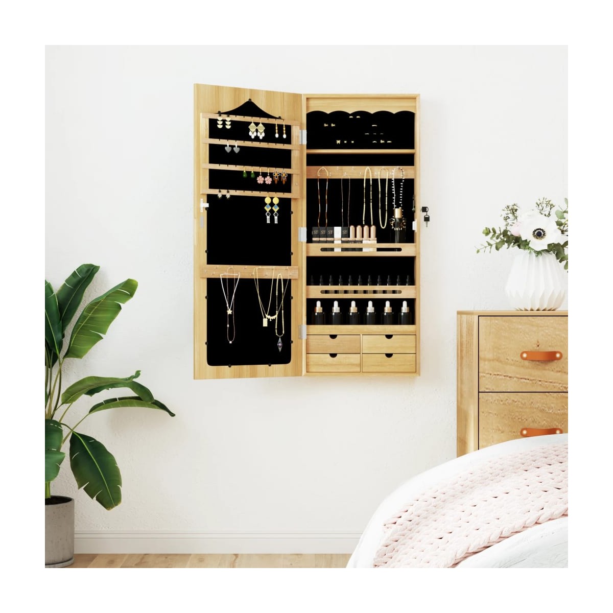 ¡Guarda las joyas y los perfumes de forma discreta y elegante con este estiloso espejo con joyero! Material duradero: La madera de ingeniería es de una calidad excepcional, con una superficie lisa, y también cuenta con fuerza, estabilidad y resistencia a la humedad. Hecho de madera de ingeniería, el joyero se limpia fácilmente con un paño húmedo. Amplio espacio de almacenaje: El espejo de almacenaje posee 4 cajones, muchos ganchos, perchas y estantes para mantener las joyas ordenadas y al alcance de la mano.Práctico espejo: Con un práctico espejo, este joyero es ideal para prepararse y maquillarse.Protección considerada: El joyero tiene una puerta con cerradura y viene con 2 llaves para garantizar la seguridad de los artículos. Además, la suave funda de tela del interior no solo aporta elegancia, sino que también protege las queridas joyas de arañazos.Diseño que ahorra espacio: Cuelga el joyero con espejo sobre la puerta con los ganchos incluidos o colócalo en la pared para no ocupar espacio en el suelo. Información útil:Se incluyen tornillos para montaje en pared.