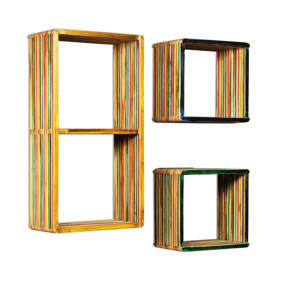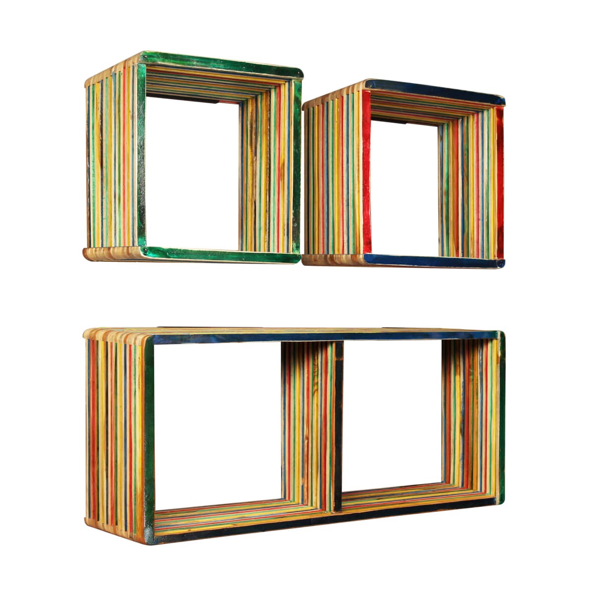 Este colorido conjunto de estanterías de pared de diseño inteligente no sólo es elegante, sino también muy práctico por su amplio espacio de almacenamiento. Este conjunto puede servir como el lugar perfecto para exhibir los artículos, tales como premios, libros, colecciones, adornos, etc. El conjunto también puede usarse como mesa auxiliar, mesa de centro y soporte, etc. Estas estanterías de pared están hechas de teca reciclada, lo que significa que cada mueble es único y ligeramente diferente de los demás. La teca reciclada es sólida, estable, duradera y bonita. También se pueden instalar fácilmente en la pared con los soportes de montaje de acero incluidos. Puedes montarlos por separado o juntos. Estas estanterías se adaptan a la decoración de cualquier habitación y convierten una pared vacía en un elemento especial. La entrega incluye 3 estantes y 3 soportes de montaje. Nota importante: Los colores varían de una pieza a otra, por lo que cada uno de nuestros estantes de pared es único. La entrega es aleatoria, garantizando la exclusividad e individualidad del producto.
