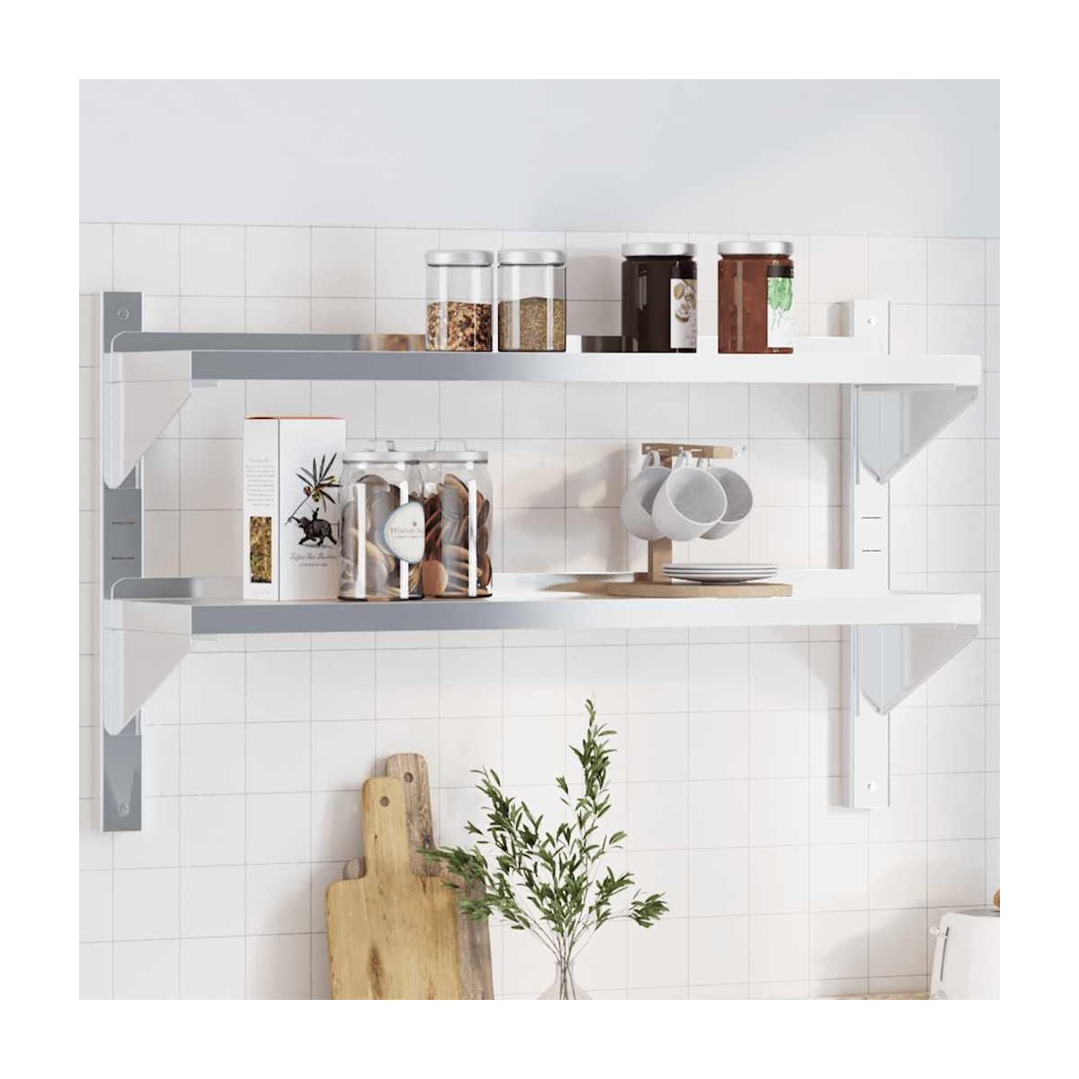 Con un diseño práctico, la estantería de pared está pensada para ser el foco de atención de tu sala de estar, dormitorio, etc. Resistente y duradero: El estante flotante de pared está hecho de acero inoxidable, lo que lo hace duradero y resistente a la corrosión.Ahorro de espacio: Este estante montado en la pared se puede montar en la pared para agregar espacio de almacenamiento extra. De este modo, podrás maximizar el espacio del suelo y mantener la zona limpia.Bordes elevados: Los artículos de decoración delicados se mantienen seguros gracias al almacenamiento en la pared con bordes elevados.Fácil de instalar: El estante de pared es fácil de instalar con los accesorios de montaje incluidos.Estante de pared multifuncional: El estante montado en la pared está hecho tanto para decorar como para almacenar artículos en varios sitios como la cocina comercial, la cocina doméstica, el garaje, el lavadero, el cuarto de servicio y técnico, el laboratorio, etc.