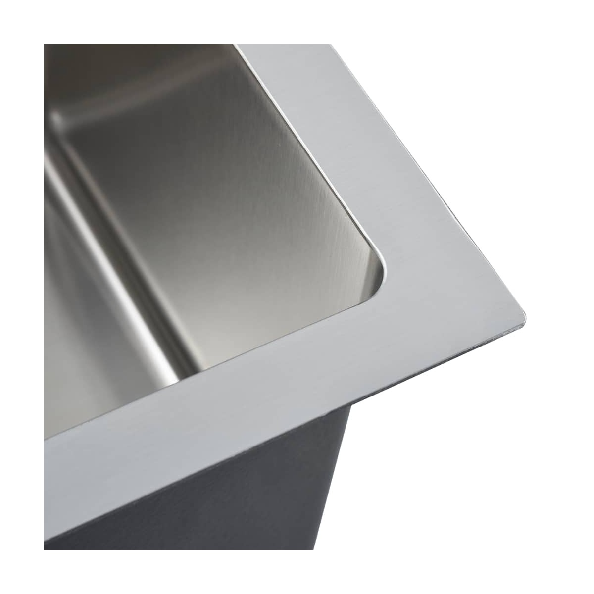 Disfruta de este fregadero de lujo con un diseño moderno y pulcro. ¡El seno con un sedoso y liso acabado satinado rezuma clase y sofisticación, ¡y se adaptará a cualquier tipo de decoración de cocina! Combinando lo mejor en función y diseño, este fregadero está hecho de acero inoxidable hecho a mano de alta calidad con pintura anticondensación, a prueba de moho, sin plomo y resistente a la corrosión. Está insonorizado con las almohadillas de reducción de sonido. Además, el recipiente con un diseño exclusivo de canal en X facilita el flujo rápido, evitando que se acumule agua en el fondo del recipiente. El fregadero puede colocarse bajo la encimera, al ras de la encimera y empotrado, para que lo pongas como tú prefieras.