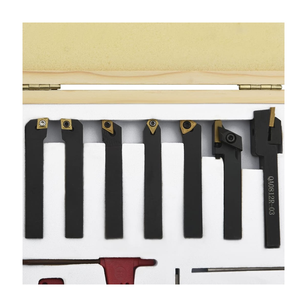 Este juego de herramientas de torneado de 8 mm consta de varias herramientas para tornear, cortar y roscar. Estas puntas de carburo son adecuadas para tornear acero y aleaciones de acero. Es un juego de herramientas ideal para el torno. Estas herramientas están fabricadas en acero al carbono y carburo cementado, ofreciendo una gran dureza y buena tenacidad. Los portaherramientas tienen un acabado liso de óxido negro, marcado con el estilo del portaherramientas y el tamaño del mango. El inserto de cada herramienta es reemplazable e indexable. Las llaves intercambiables también se incluyen en la entrega. El conjunto se entrega con una caja para facilitar su almacenamiento y transporte.