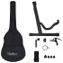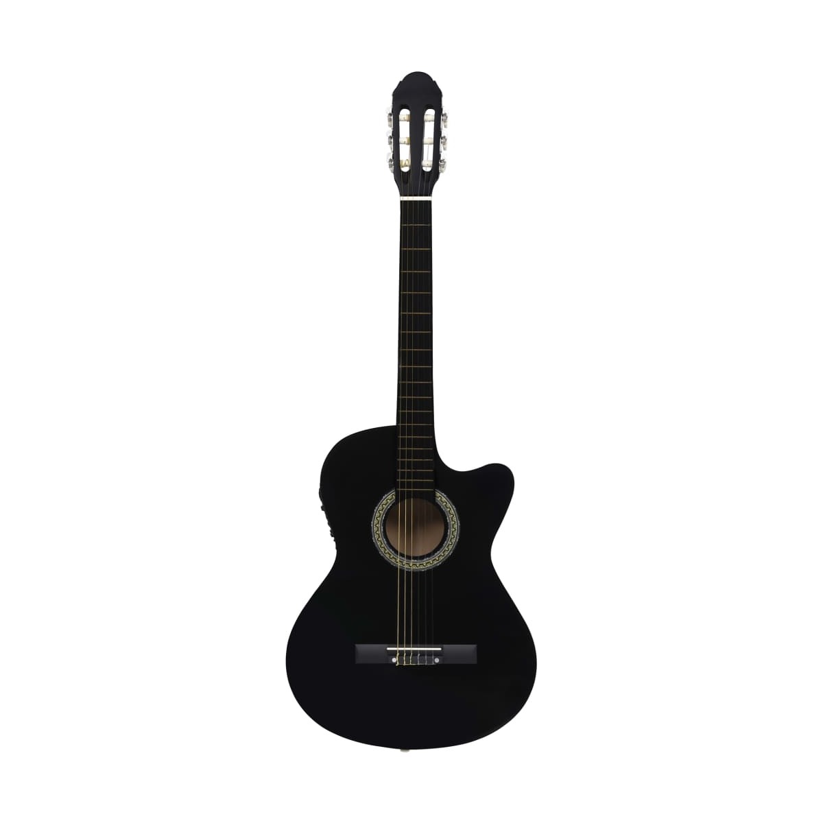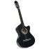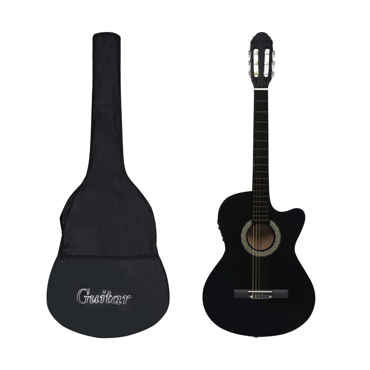 Nuestra guitarra occidental con cutaway es un gran instrumento para principiantes, aficionados y músicos con cualquier nivel. Además de una guitarra, el conjunto viene con una funda de guitarra, correa, púas, portapúas, set de cuerdas de guitarra, manivela de cuerdas, cejilla, afinador cromático y soporte para guitarra. Esta guitarra está hecha de madera maciza de tilo con clavijas y traste de plástico duro. Tiene 6 cuerdas y ecualizador (EQ de 4 bandas). El ecualizador (EQ de 4 bandas) posee la función de ajustar el tono de la guitarra al conectarla al altavoz. La excelente calidad de sonido y el bonito diseño hacen que sea muy valiosa. Con una escala de 65 cm, esta guitarra tiene todo lo que necesitas para convertirte en un gran guitarrista. El afinador ayuda a afinar las cuerdas de la guitarra mientras que la cejilla ayuda a ajustar el tono de la guitarra. Las 3 púas se usan para puntear las cuerdas y se pueden guardar en el portapúas. Suelen ser un sustituto de los dedos, pero también puedes tocar la guitarra con ambos. La manivela de cuerdas, como herramienta útil que es, facilita el proceso de cambiar las cuerdas. La funda incluida con una correa es perfecta para músicos viajeros y para facilitar el almacenaje. Además, puedes colocar la guitarra en el soporte, que resulta muy práctico. Nuestro set de guitarra es fácil de montar.