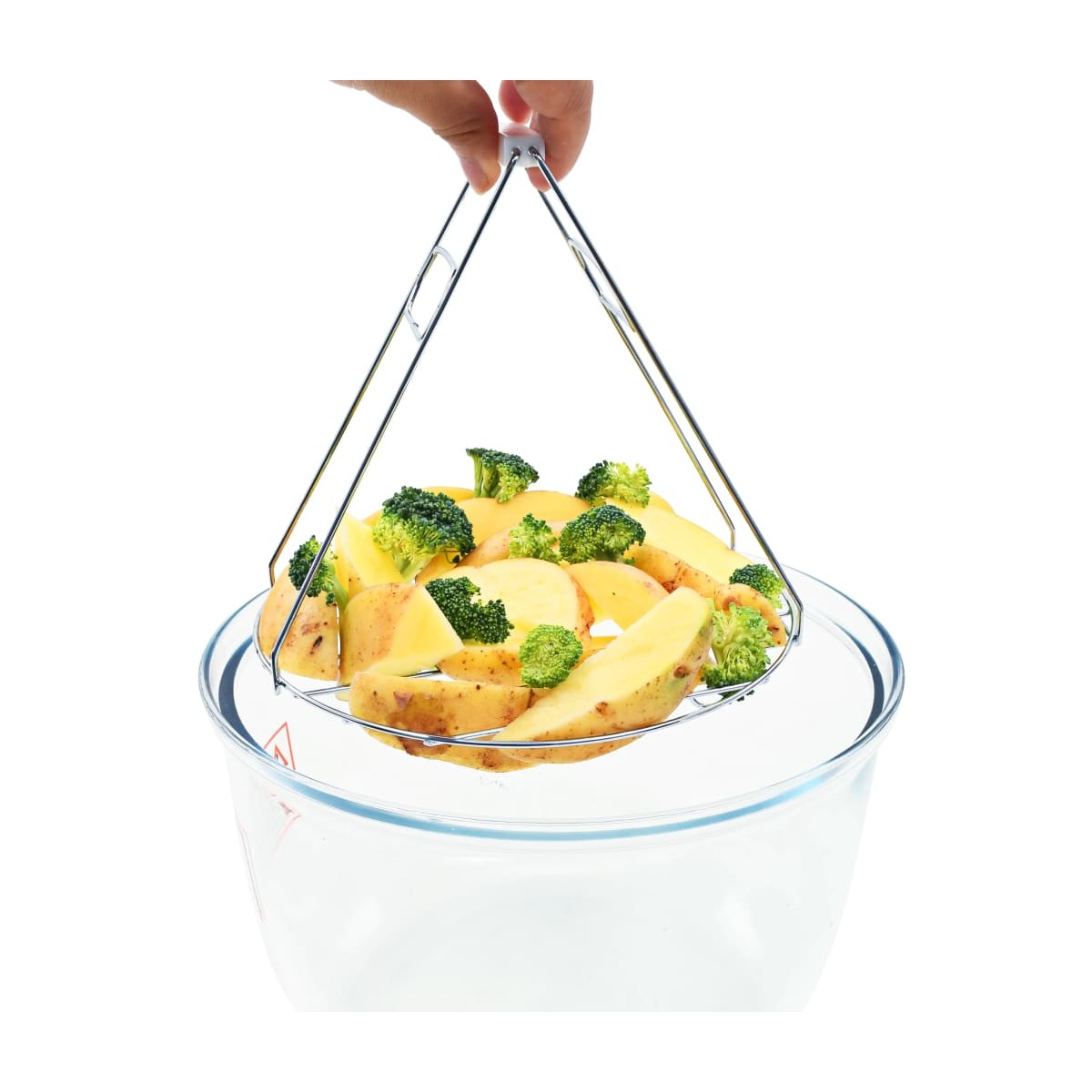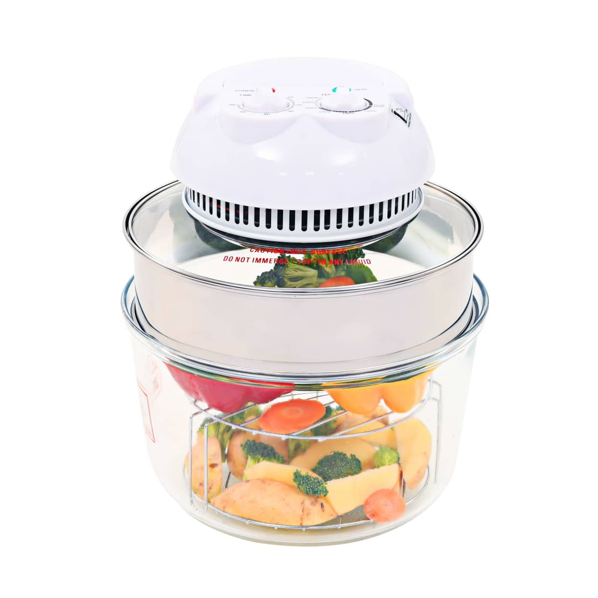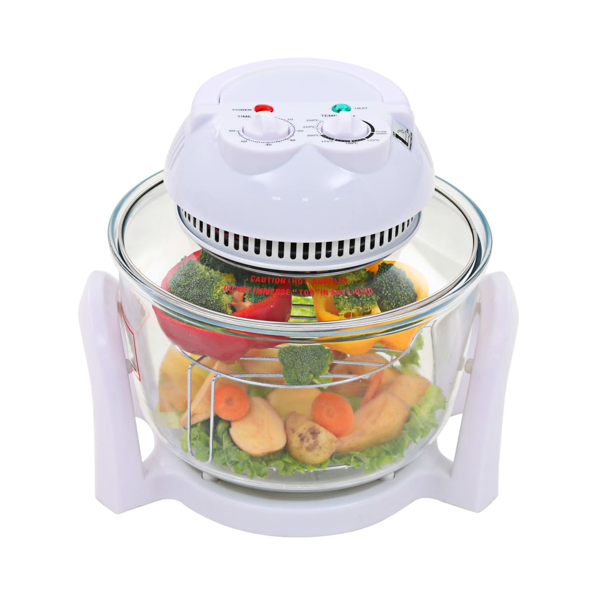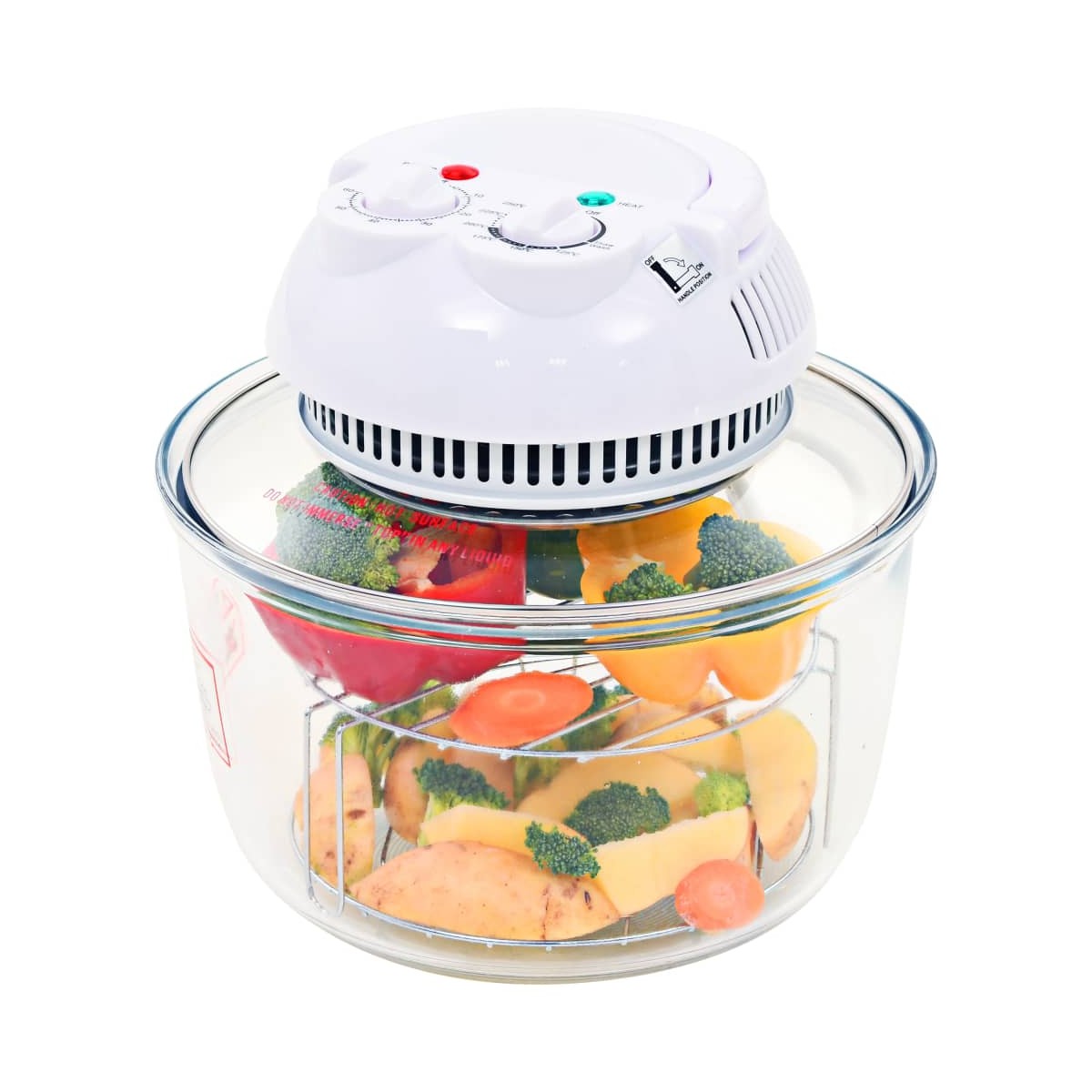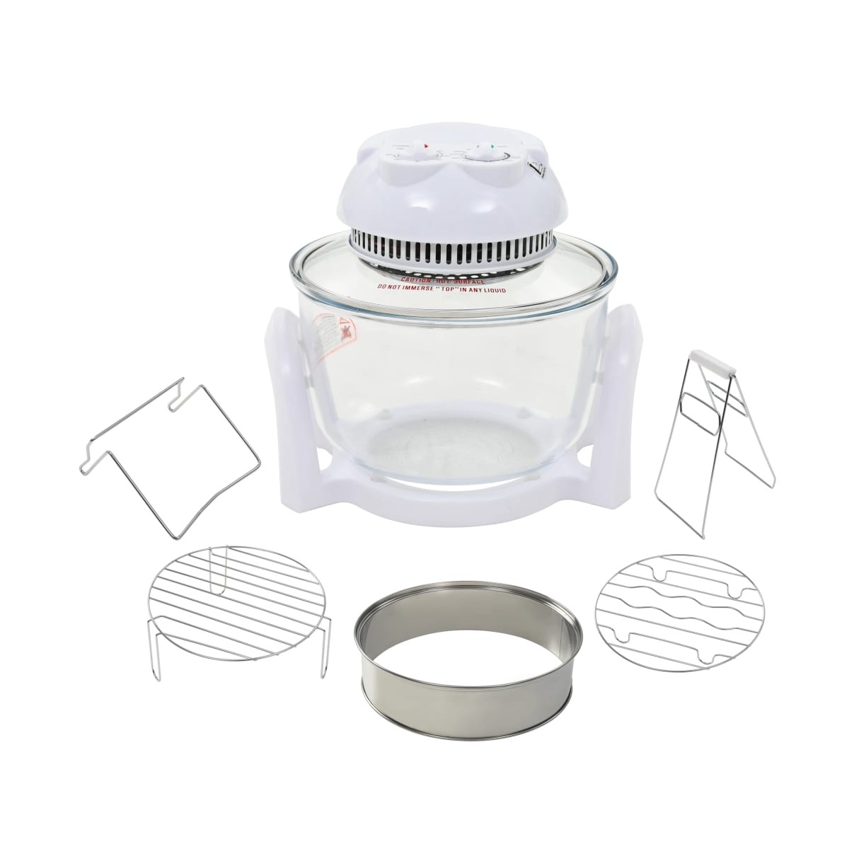 Con este horno halógeno, puedes preparar una deliciosa comida rica en vitaminas y nutrientes en menos tiempo que con los métodos tradicionales. El cuenco del horno halógeno está hecho de vidrio, por lo que puede observar claramente el proceso de cocción. Tiene una gran capacidad de 7 L + 3 L (con el anillo de extensión incluido) para que quepan grandes cantidades de alimentos. El horno cocina los alimentos haciendo circular el aire caliente alrededor de los alimentos de manera uniforme y completa, y por lo tanto requiere menos tiempo de cocción que el horno de convección promedio, lo que hace que ahorre energía y tiempo. El anillo de extensión ayuda a ampliar el espacio del horno halógeno para comidas más grandes. Los accesorios incluyen un estante bajo, estante alto, tenazas, un anillo de extensión y un soporte de tapa. El montaje es fácil.