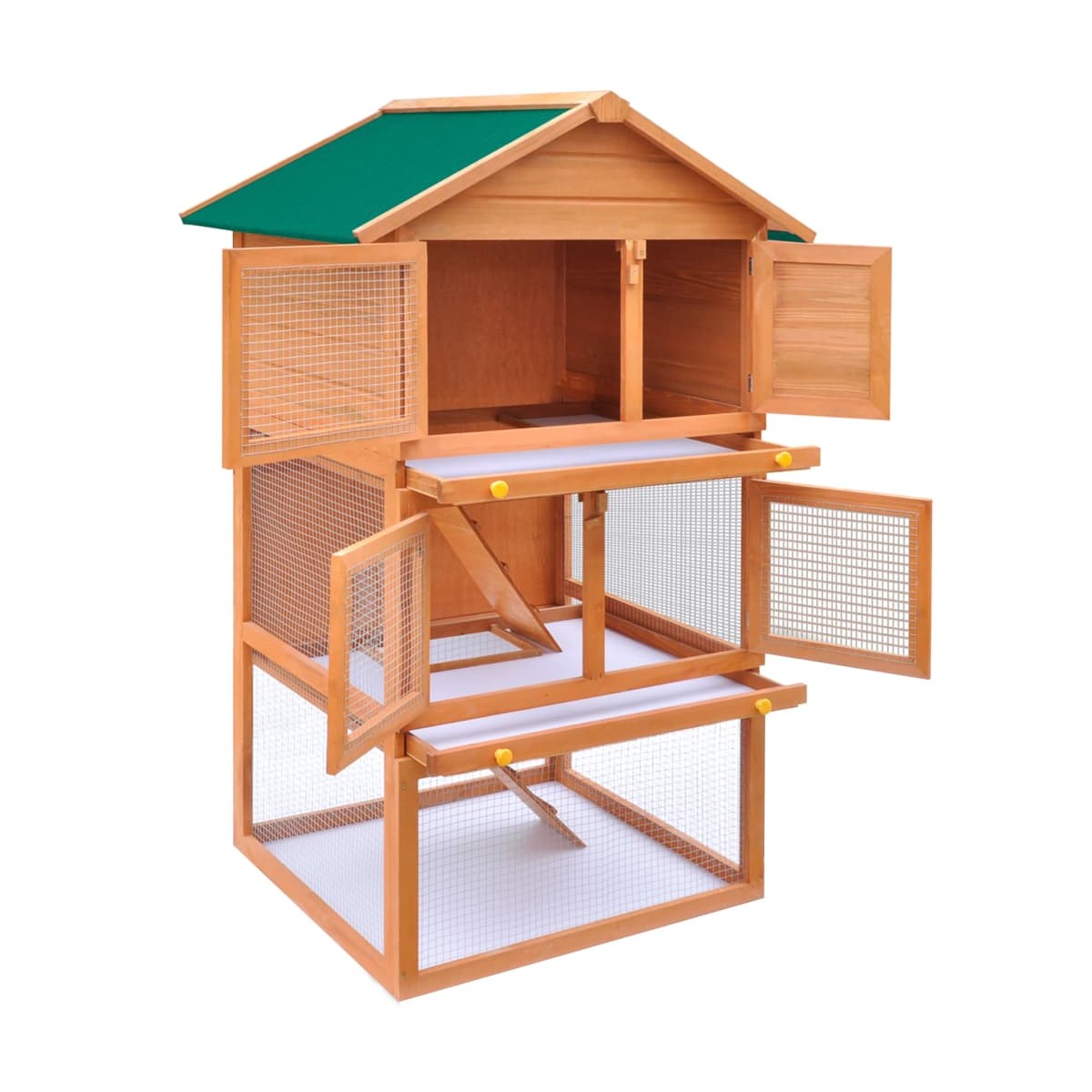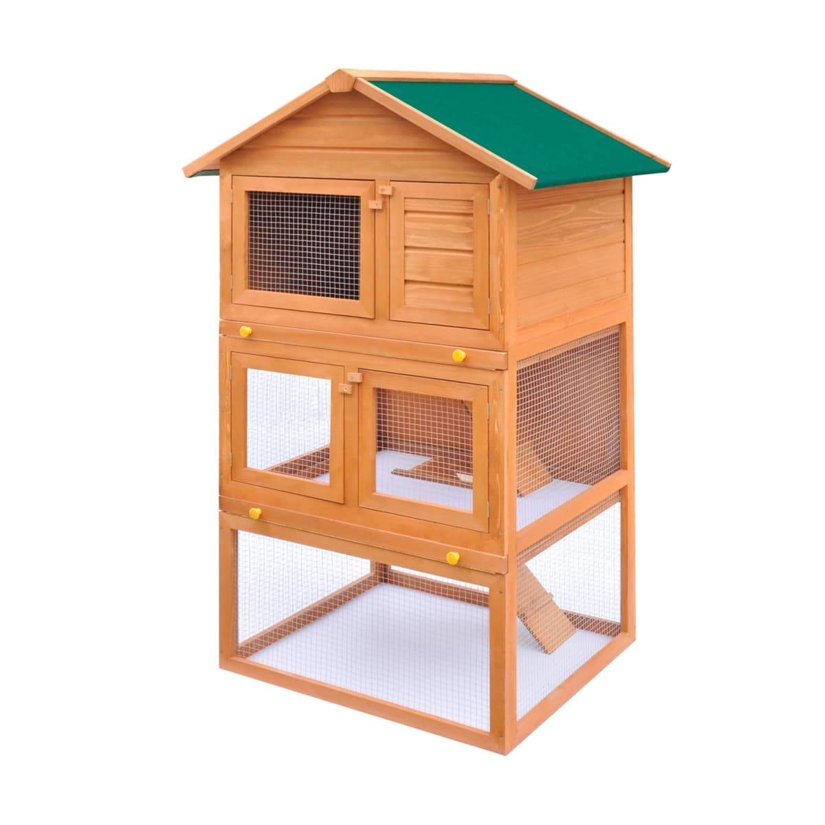 Esta cómoda de 3 pisos proporciona un lugar grande y acogedor para guardar animales pequeños, especialmente lindos conejos. Presenta múltiples usos: jugar, hacer ejercicio, entrenar o simplemente mantener a sus mascotas de manera segura. Esta conejera brinda a tus mascotas mucho espacio para ejercitarse, mientras que la malla de alambre apretada ayuda a prevenir conductas maliciosas y accidentes inesperados. La rejilla de alambre de hierro garantiza el control de las mascotas y permite a tus mascotas vigilar el entorno y obtener suficiente aire fresco. La conejera está construida con una estructura de madera de alta calidad, por lo que es un recinto fuerte y seguro que dura años. Su techo verde evita la lluvia, mientras que el acogedor cubículo es el lugar perfecto para dormir. Dos escaleras de fácil ascenso conducen desde el nivel del suelo inferior al superior. Dos bandejas extraíbles facilitan la limpieza. Y las puertas se cierran fácilmente y se cierran con pernos de deslizamiento Esta jaula de madera de 3 capas es perfecta para mascotas pequeñas. Nota importante: Recomendamos que coloques la jaula para conejos bajo techo. En consecuencia, tendrá una vida útil más larga.