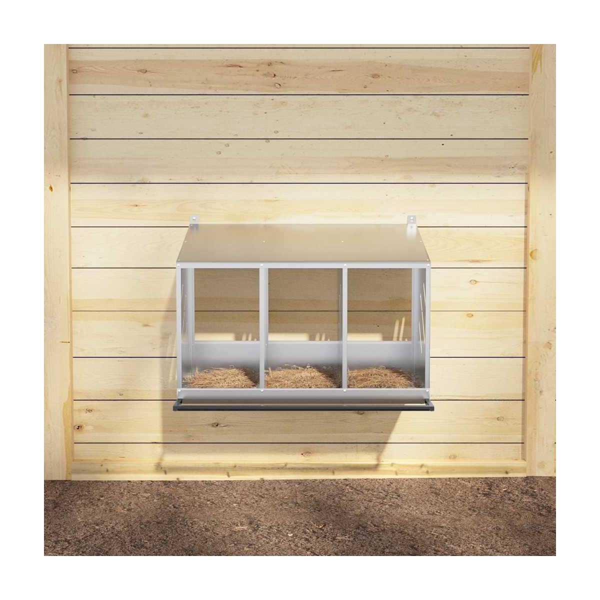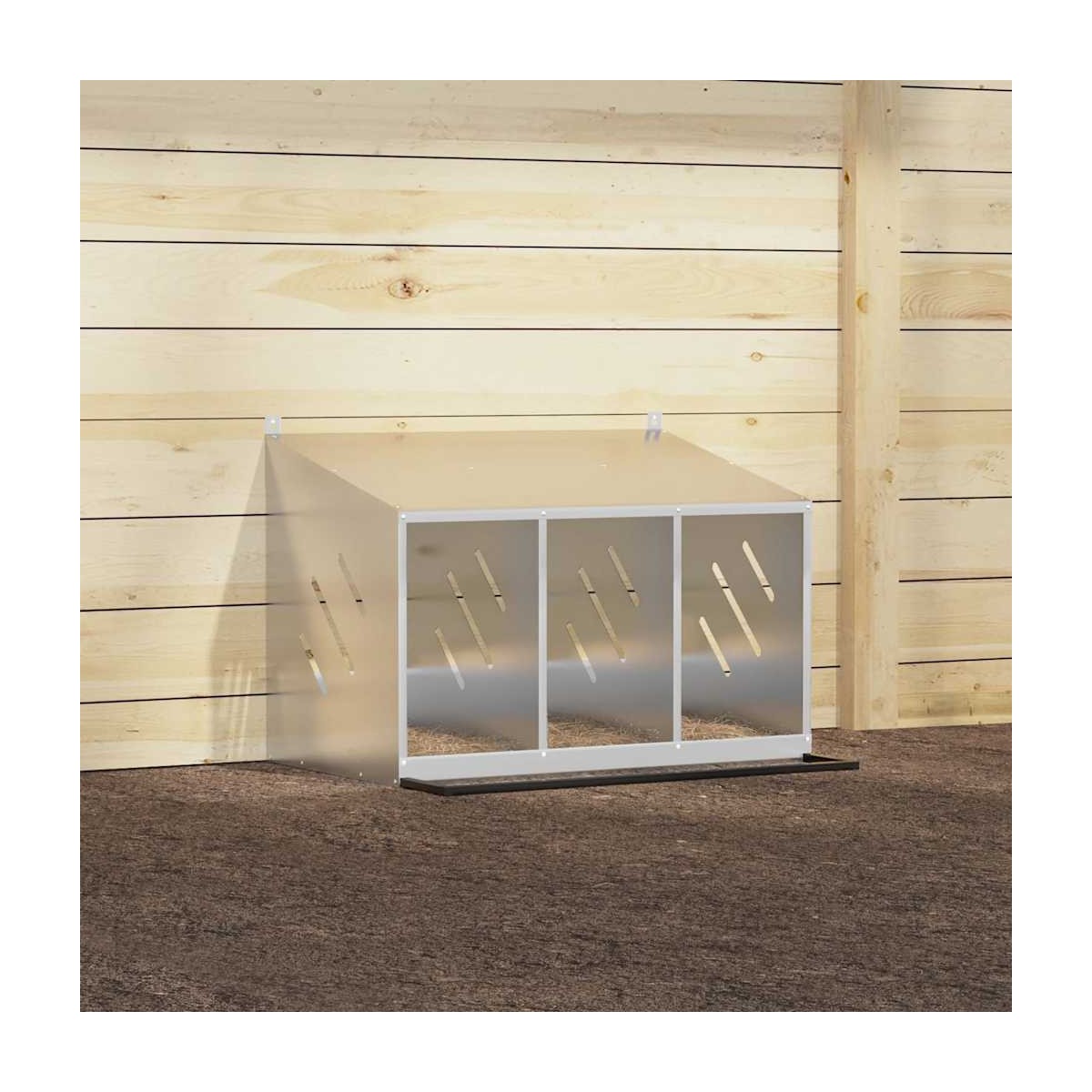 Este nido para gallinas ofrece un espacio amplio y organizado para que sus gallinas pongan sus huevos cómodamente. Resistente y duradera: la caja para huevos está hecha de láminas laminadas en frío y láminas galvanizadas, que son duraderas, resistentes y resistentes a la intemperie. También mantiene los huevos eclosionados secos y limpios, lo que garantiza un entorno saludable para las gallinas y mejora la producción de huevos.Techo inclinado: El techo inclinado evita que las gallinas se sienten en el nido y evita que el agua se acumule en los días de lluvia.Diseño de entrada de percha: La percha integrada facilita que las gallinas entren y salgan del nido, lo que promueve la facilidad de uso.Buena transpirabilidad: hay orificios de ventilación en ambos lados de la caja para el flujo de aire, lo que ayuda a mantener el área de anidación seca y cómoda y garantiza un ambiente saludable para sus gallinas.Fácil de usar: Gracias a su base inclinada y desmontable y a su superficie lisa, este nido para gallinas es fácil de limpiar y requiere menos mantenimiento. Además, el nido cuenta con prácticos orificios que permiten colgarlo fácilmente en la pared o colocarlo en el suelo según tus necesidades. Información útil:Utilice guantes (no incluidos) para evitar rayones durante la instalación.