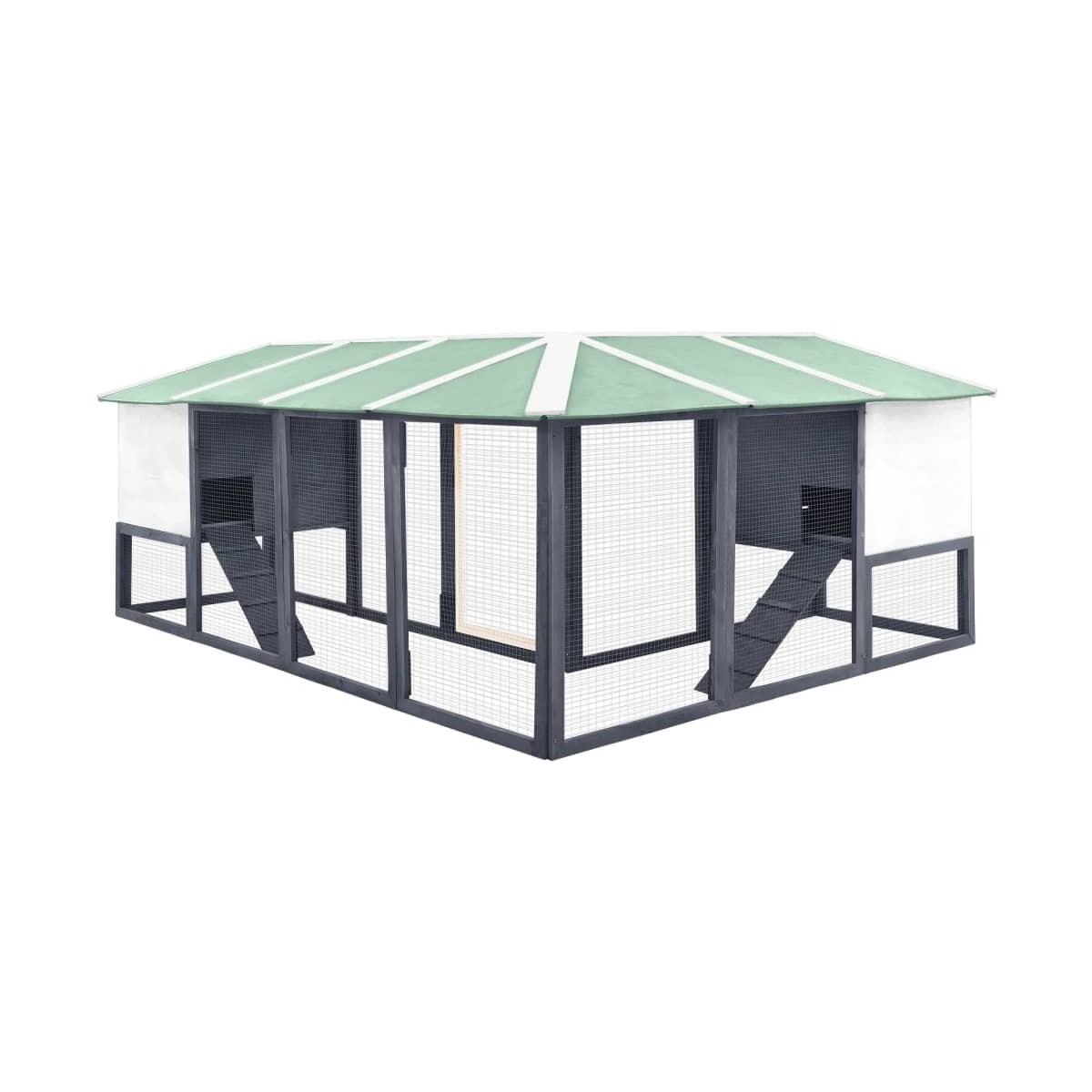 Esta conejera de madera proporciona un lugar grande y cálido para acoger animales pequeños, en especial a lindos conejitos. Sirve para muchas cosas: jugar, hacer ejercicio, adiestrar o simplemente para que las mascotas estén a salvo. La jaula para conejos tiene un diseño integral con dos casas y un corredor muy grande con malla metálica de acero galvanizado. Así, podrás vigilar las mascotas y también evitar accidentes inesperados. Asimismo, podrás controlar a los conejos y ellos dispondrán de suficiente aire libre. La caseta para mascotas tiene una estructura de madera maciza de abeto, por lo que es estable y duradera. Además, el tejado inclinado cuenta con una tela resistente al agua y mantiene alejada la lluvia. El cubículo ofrece la zona perfecta para dormir. La rampa antideslizante conduce desde la planta baja hasta la planta superior. Este hábitat para animales pequeños es una elección excelente para tener a las mascotas en el jardín.