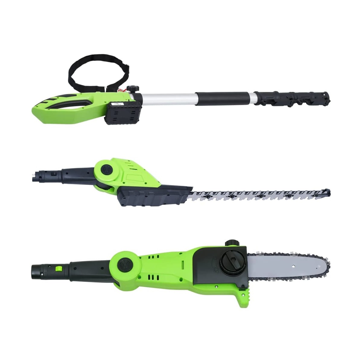 Esta herramienta eléctrica de jardín sin cables 2 en 1, viene con una podadora con pértiga y una sierra de pértiga. La herramienta eléctrica, equipada con un eje telescópico, es una herramienta de jardín ideal para dar forma a los setos y arbustos altos o recortar las ramas altas de difícil acceso. Con un cabezal pivotante, la herramienta eléctrica te permite cortar la parte superior de las ramas o los setos de manera más eficiente en una variedad de ángulos, asegurando un acabado limpio. Para tu comodidad y confort, el eje telescópico de aluminio puede extenderse hasta 220 cm para la recortadora de pértiga y 243 cm para la sierra de pértiga. Esto te permite llegar hasta la parte superior sin usar una escalera. El diseño sin cable ofrece mayor flexibilidad, ya que no tiene la limitación de llegar a la alimentación como sucede con otros equipos que necesitan electricidad de 220 V, ni la molestia de las herramientas de gasolina (gases de escape y consumo de gasolina y aceite). La sierra se suministra con un cargador y una batería de 20 V 1500 mAh Li-ion. El tiempo máximo de funcionamiento es de 20 minutos para la sierra de pértiga y de 45 minutos para la recortadora de pértiga.
