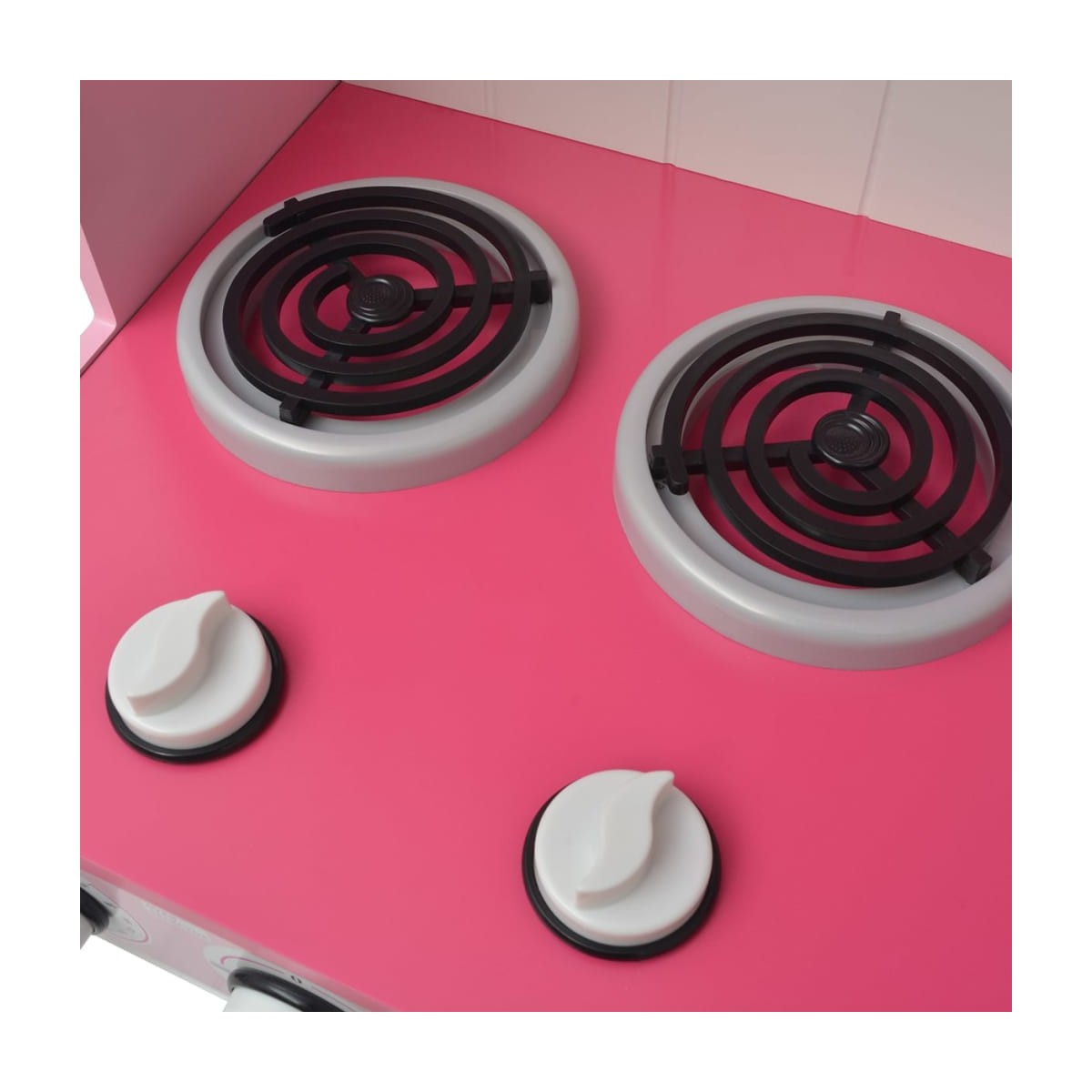 ¡Tus niños disfrutarán de horas de juego imaginativo con esta cocina divertida y duradera! Esta cocina de juguete adorable y fácil de montar está hecha de MDF y madera de pino y ha sido bellamente diseñada. Las ventanas con cortinas, sus colores vivos y su aspecto tradicional hacen que la cocina parezca real. Tiene un grifo con fregadero y botones de horno con un clic, lo que hace que la experiencia de cocinar sea más realista. La hornilla tienen 2 botones giratorios que le permiten a su pequeño chef ajustar la temperatura. Dos amplios armarios y un estante de dos niveles brindan amplio espacio de almacenamiento. Un reloj con manecillas móviles adorna la puerta del mueble superior, un horno con 2 compartimentos y un microondas en la parte superior completan los aparatos de cocina. A sus hijos no sólo les encantará jugar con esta cocina de juguete, sino que también les ayudará a desarrollar de manera lúdica la comunicación y las habilidades sociales.