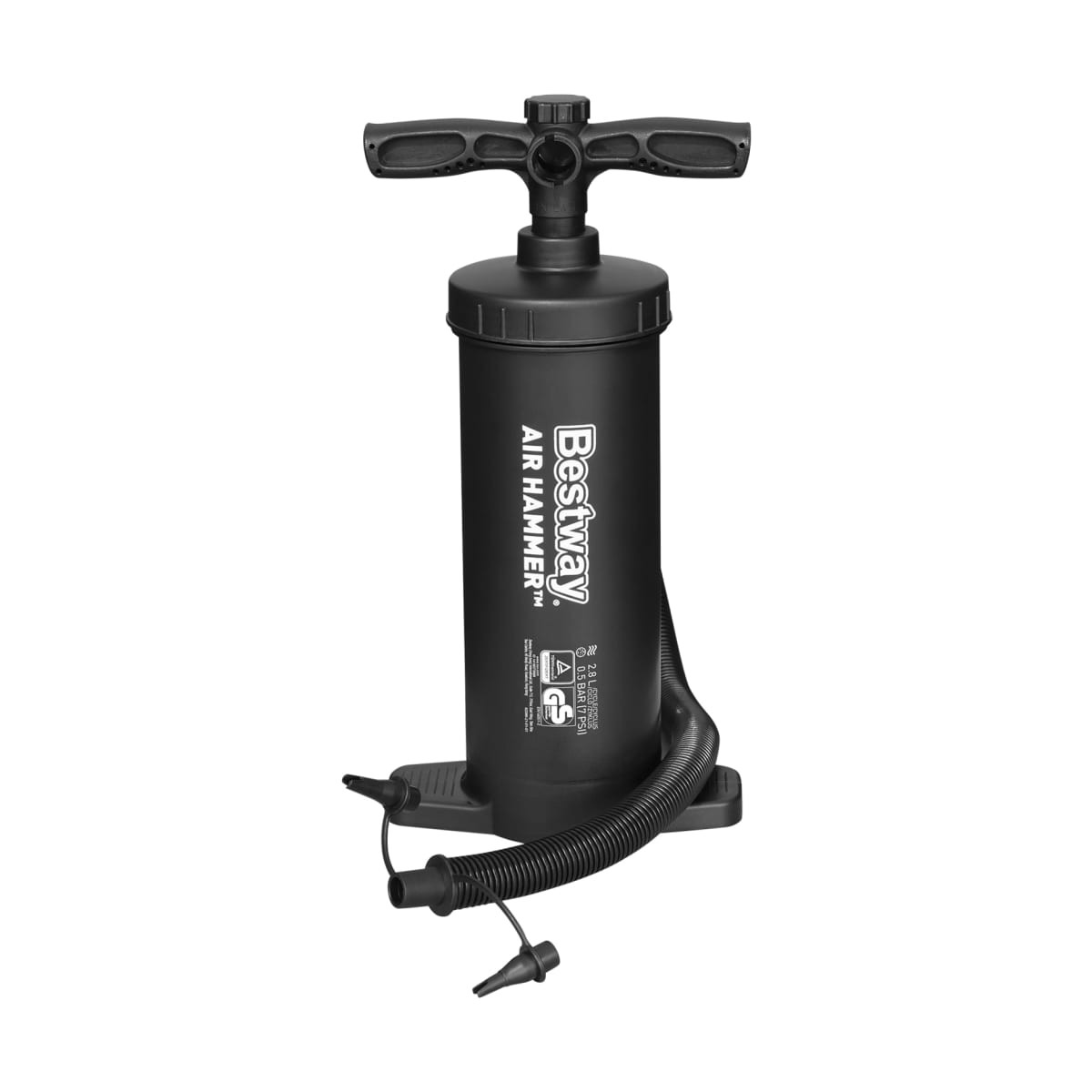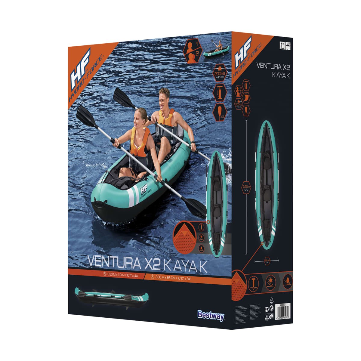 Este Kayak Hydro-Force Ventura X2 de Bestway es excelente para un viaje recreativo en la piscina o en un lago. El revestimiento de nailon de primera calidad del Kayak Ventura, construido especialmente para los aventureros más duros, puede soportar algunos de los elementos más duros y es resistente al sol, el aceite y el agua de mar. El revestimiento de nailon de primera calidad también es resistente a pinchazos y está construido para soportar las aguas de río fuertes y a menudo rocosas. Este Kayak duradero puede maniobrarse por ríos y lagos sinuosos y por aguas tranquilas y abiertas o sobre el reflujo y el flujo de las olas. Las 2 cámaras laterales extraíbles están fabricados en PVC de alta resistencia. Las aletas extraíbles maximizan la velocidad y controlan la dirección para lograr estabilidad direccional. Está equipado con 2 asientos ajustables con compartimentos de almacenamiento, lo que lo hace perfecto para tus aventuras con un amigo. Puedes sujetar los remos de aluminio de doble hoja de forma segura en su sitio con los soportes de remos. Cuando está completamente inflado con la bomba de mano Air Hammer, el Kayak mide 3,3 m de largo y puede transportar hasta 200 kg.