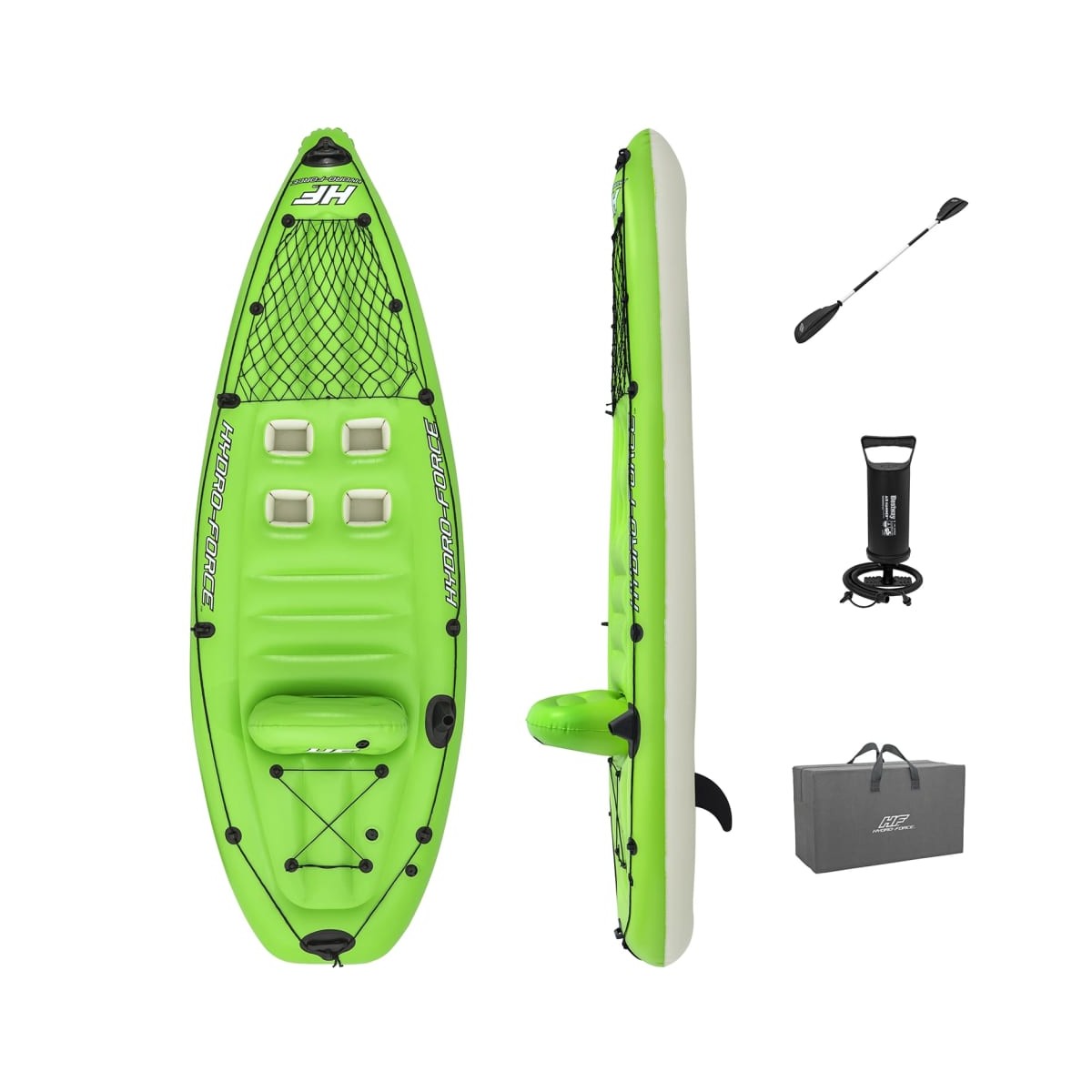 Disfruta de la calma del día en el agradable agua del verano con el kayak recreativo Hydro-Force de Bestway. Kayak duradero y estable: Este kayak inflable, fabricado con material de PVC duradero, puede soportar las aguas turbulentas y, a menudo, rocosas. Los estabilizadores desmontables de diferentes tamaños refuerzan la estabilidad direccional del kayak.Inflado rápido: Se incluye la bomba manual para que puedas inflarlo en unos pocos minutos. Simplemente ínflalo cuando estés listo para usarlo y desínflalo cuando hayas terminado. Es perfecto para transportarlo y almacenarlo de forma compacta.Máxima comodidad: Además de un soporte para la caña de pescar incorporado y broches para remos, este kayak también posee un respaldo inflable para ofrecer la máxima relajación. También hay 4 reposapiés para acomodar a usuarios de todas las alturas.Gran experiencia: Es ideal para el remero que busca disfrutar de una experiencia de kayak estable y relajante en lagos y ríos tranquilos durante el verano. ¡Es perfecto para pescar, acampar o tan solo navegar!