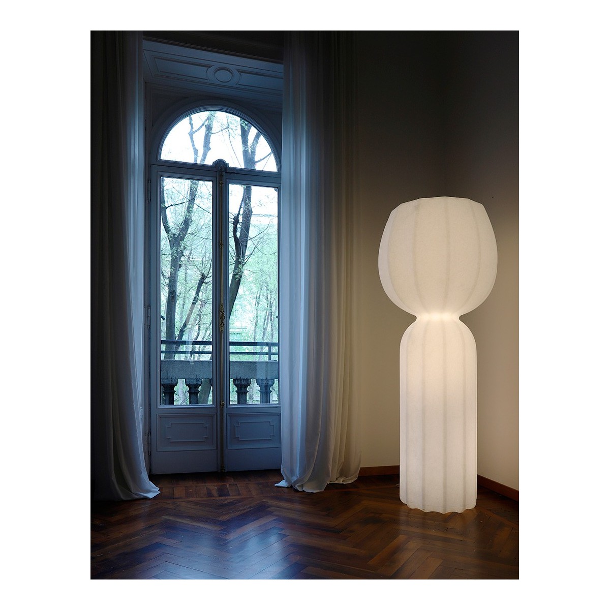 Cucun es una gran lámpara de pie inspirada en las formas sencillas y naturales de flores, verduras y bulbos. La particular estructura en polietileno rotacional recuerda, en la textura de la superficie y en las nervaduras, un revestimiento de resina que retoma los temas de algunos iconos del diseño italiano de los años sesenta, creando suaves efectos de iluminación.