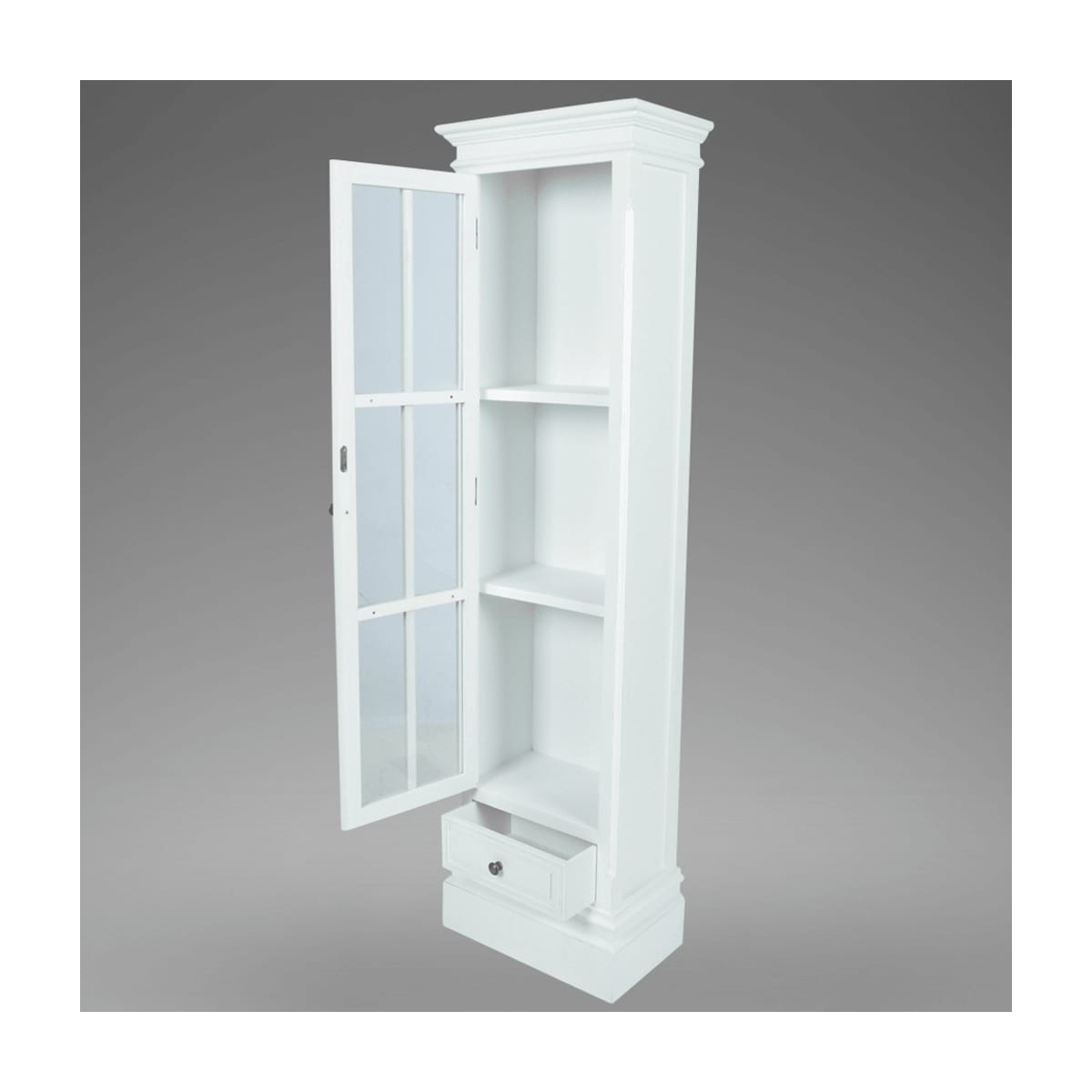 Esta gran estantería cuenta con tres estantes y con un cajón en su parte baja. Así mismo cuenta con una puerta de cristal para proteger los estantes de la suciedad y del polvo. Se trata de una pieza de mueble ideal como organizador para su oficina, sala de estar, dormitorio o en cualquier otra habitación de la casa. Este mueble estantería está realizada con tablero duradero y ligero de fibra de densidad media, pintado en blanco y con un aspecto primitivo, vintage, envejecido. Su diseño versátil y elegante lo convierte en un gran accesorio en su hogar. Nota: Debido a que este mueble está realizado a mano, de madera y pintado de blanco, podría venir con pequeños defectos.