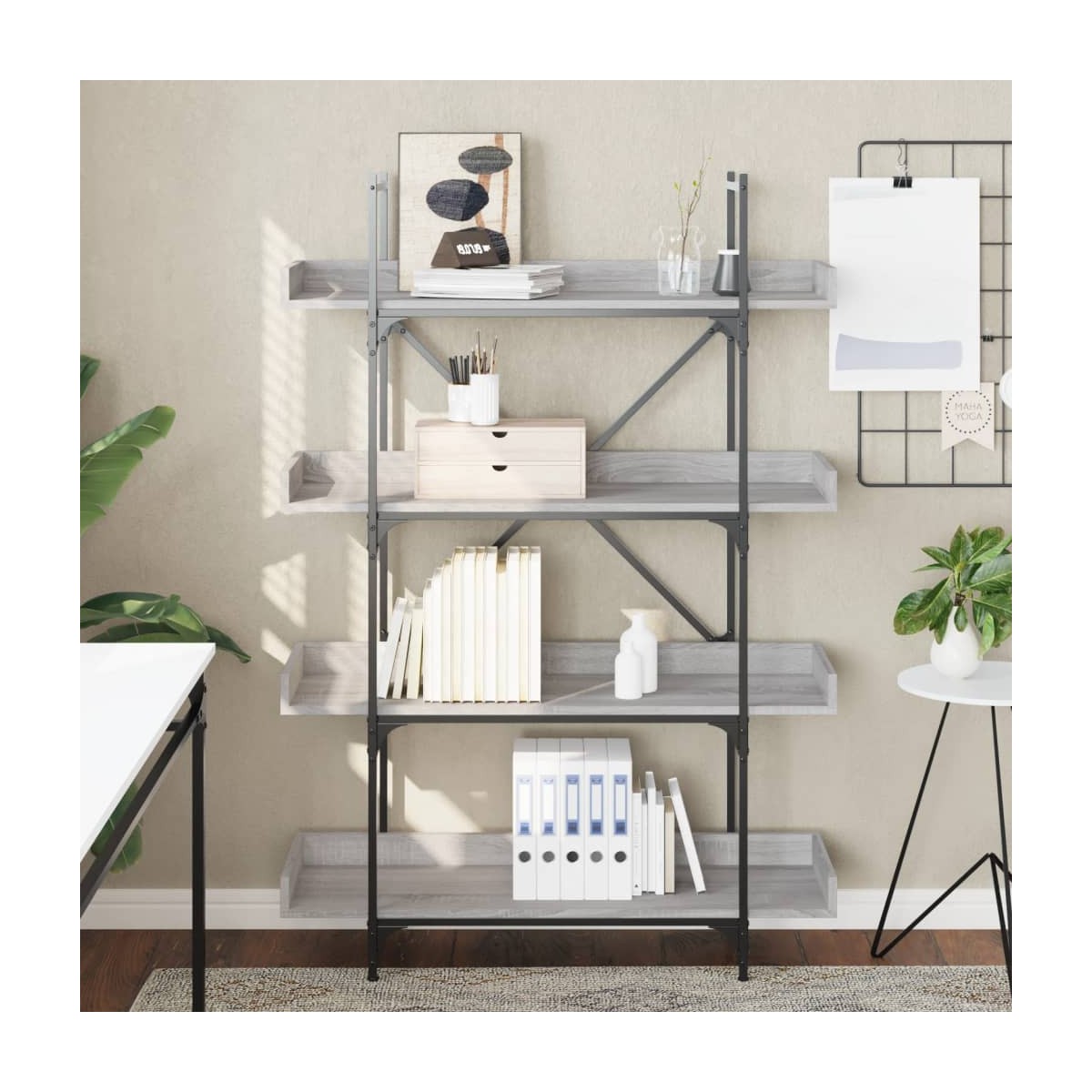 Esta librería ofrece una solución ideal para organizar los libros y será un complemento decorativo y práctico para la decoración de tu hogar. Material duradero: La madera contrachapada tiene una calidad excepcional, con una superficie lisa y también cuenta con fuerza, estabilidad y resistencia a la humedad. Fabricada en madera de ingeniería, la estantería es fácil de limpiar.Amplio espacio de almacenaje: La estantería ofrece un amplio espacio de almacenaje para mantener bien organizados y al alcance revistas, libros, artículos decorativos y otros objetos de uso diario.Patas ajustables: Las patas regulables con tacos de plástico mantienen equilibrada la estantería sobre suelos irregulares y aumentan su estabilidad.Diseño bien pensado: Los bordes elevados (tanto laterales como traseros) de los estantes evitan que tus pertenencias se caigan y protegen las paredes de la suciedad y los arañazos.Estructura estable: La barra en X y la estructura metálica añade un estilo industrial a la casa, además de garantizar su durabilidad y estabilidad. Advertencia:Para evitar que vuelque, este producto debe usarse con el dispositivo de fijación a la pared incluido.