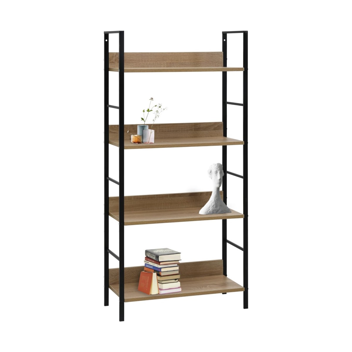 Este mueble estantería de 4 niveles puede usarse en el salón como una librería o para colocar objetos decorativos, o en el patio para poner plantas, etc. Es un aporte atemporal para la decoración de tu hogar. La estantería está hecha de madera de ingeniería, por lo que se limpia fácilmente con un paño húmedo. La robusta estructura de acero la hace inoxidable y refuerza su estilo industrial. La estantería de almacenaje tiene un diseño compacto, por lo que saca el máximo partido a los espacios limitados. Este mueble tiene 4 niveles, por lo que te ofrece amplio espacio para guardar y colocar tu colección de libros, flores, CD, DVD y demás objetos decorativos. Nuestra estantería de pie es fácil de montar.