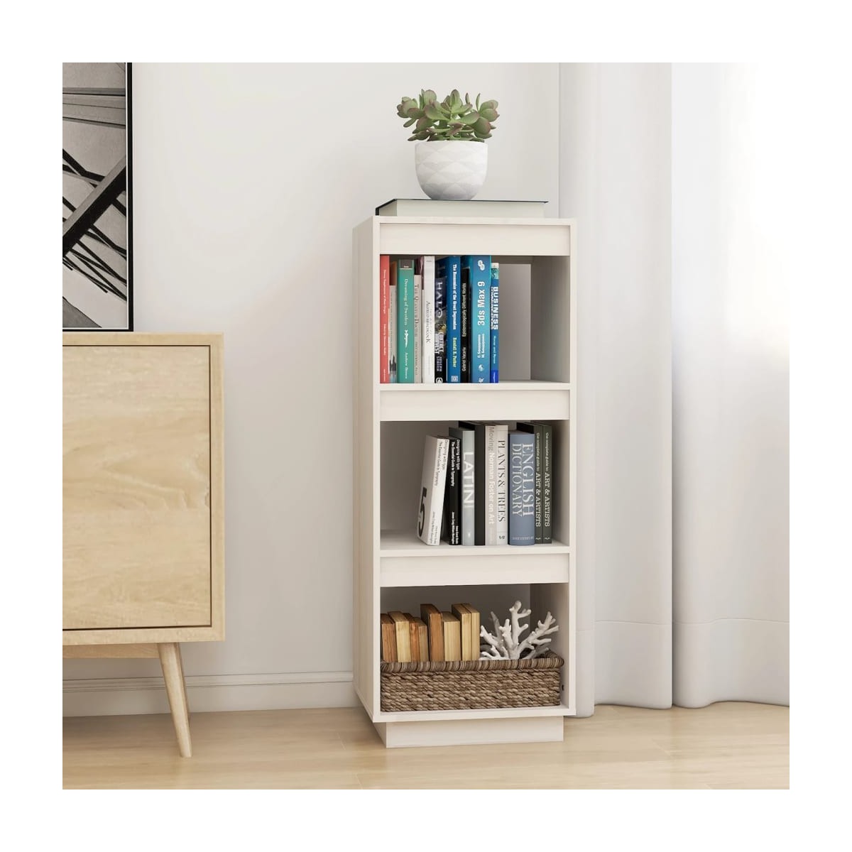 Con un diseño elegante y hermoso, este mueble para libros de madera será un aporte decorativo y práctico para tu decoración. El estante para libros está hecho de madera maciza de pino, lo que lo hace robusto y estable. Diseñada con 3 espaciosos compartimentos, la estantería ofrece un amplio espacio de almacenamiento para mantener tus revistas, libros, DVD, dispositivos multimedia y otros artículos decorativos bien organizados y al alcance de la mano. Además, como estante versátil, también puede servir como separador de ambientes, lo que lo convierte en la opción perfecta para tu pasillo y cualquier otro espacio. El estante para libros es fácil de limpiar con un paño húmedo.