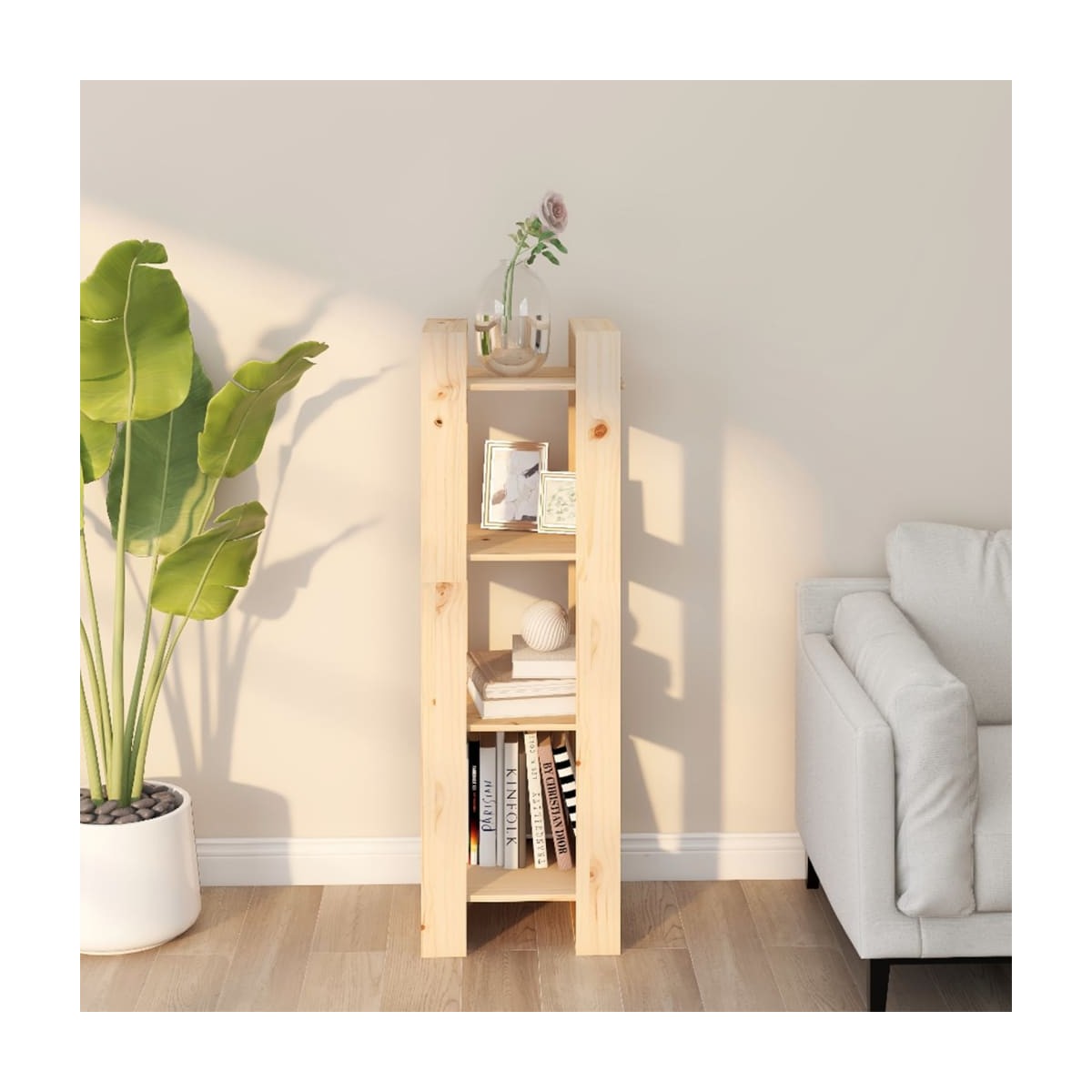 Esta versátil estantería para libros de madera está destinada a ser un aporte decorativo y práctico para la decoración de tu hogar. También se puede utilizar como separador de ambientes. Material de primera calidad: La madera maciza de pino es un bonito material natural. Trata la superficie con aceite, cera, laca o un acabado de barniz para conseguir una superficie más fuerte y más fácil de limpiar. La madera de pino tiene vetas rectas, y los nudos dan al material su distintivo aspecto rústico.Estructura robusta y estable: La estructura de madera de la estantería garantizan su solidez y estabilidad.Amplio espacio de almacenamiento: La estantería ofrece un amplio espacio de almacenamiento para guardar tus revistas, libros, DVD, dispositivos multimedia y otros objetos decorativos bien organizados y a tu alcance.Estantería versátil: La estantería también puede servir como divisor de habitaciones, por lo que es una opción perfecta para tu pasillo y cualquier otro espacio habitable.Hermoso diseño: La estantería para libros no tiene parte trasera, por lo que la parte delantera y la trasera son hermosas. Advertencia:Para evitar el vuelco, este producto debe usarse con el dispositivo provisto para fijarlo a la pared.