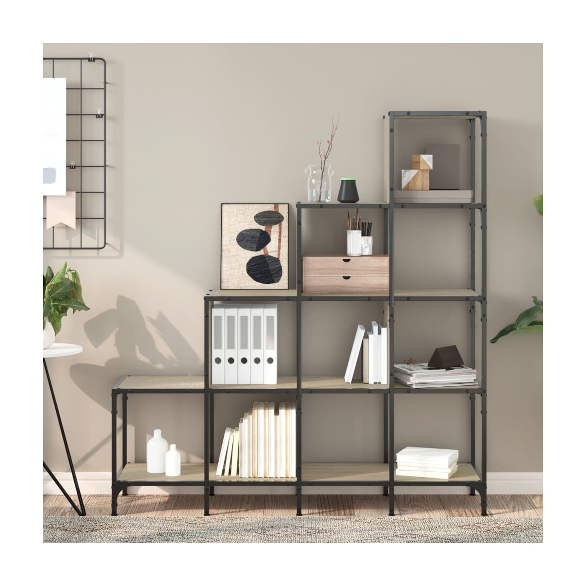 Esta librería, con su estructura elegante pero funcional inspirada en las escaleras, se convertirá en el centro de atención de cualquier habitación. Material duradero: La madera de ingeniería tiene una calidad excepcional, con una superficie lisa y también cuenta con fuerza, estabilidad y resistencia a la humedad.Estructura robusta: La estructura de metal garantiza su solidez y estabilidad.Amplio espacio de almacenamiento: Diseñada con estantes abiertos por escalera, esta estantería para libros ofrece un amplio espacio para mantener tus elementos esenciales al alcance de la mano y bien organizados.Diversos usos: Esta estantería será ideal para tu colección de libros. También se puede utilizar como estantería de exposición para coleccionables, fotos, premios, plantas en maceta, etc.Pies ajustables: El soporte para libros está equipado con 4 patas ajustables que pueden proteger tu suelo de arañazos y mantenerlo estable en el piso irregular. Advertencia:Para evitar que vuelque, este producto debe usarse con el dispositivo de fijación a la pared suministrado.
