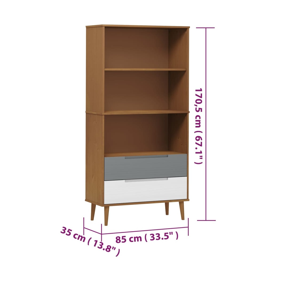Esta clásica estantería de madera, de diseño escandinavo, es un complemento tanto decorativo como práctico para tu decoración actual. Madera de pino maciza: La madera de pino maciza es un bonito material natural. La madera de pino tiene vetas rectas, y los nudos dan al material su distintivo aspecto rústico.Barniz UV: El barniz UV es un tipo especial de barniz que se acaba con una máquina de secado ultravioleta. Crea un acabado más vívido, más lujoso y más táctil en comparación con los barnices que no son UV.Amplio espacio de almacenaje: La librería está diseñada con 3 compartimentos y 2 cajones, que ofrecen amplio espacio de almacenamiento para guardar bien organizados y al alcance revistas, libros, DVD, dispositivos multimedia y otros objetos decorativos. Advertencia:Para evitar el vuelco, este producto debe usarse con el dispositivo provisto para fijarlo a la pared. Nota:Cada producto viene con un manual de montaje en la caja para facilitar el montaje.