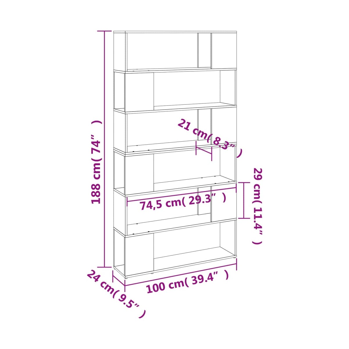 Este clásico mueble para libros, con un diseño elegante, es un complemento tanto decorativo como práctico para tu decoración. Material duradero: La madera contrachapada tiene una calidad excepcional, con una superficie lisa y también cuenta con fuerza, estabilidad y resistencia a la humedad.Amplio espacio de almacenaje: La librería está diseñada con 6 espaciosos compartimentos, que ofrecen un amplio espacio de almacenamiento para guardar revistas, libros, DVD, dispositivos multimedia y otros objetos decorativos bien organizados y al alcance.Estantería versátil: La estantería también puede servir como divisor de habitaciones, por lo que es una opción perfecta para la casa.Superficie fácil de limpiar: La librería es fácil de limpiar con un paño húmedo. Advertencia:Para evitar que vuelque, este producto debe usarse con el dispositivo de fijación a la pared incluido. Información útil:Para facilitar al máximo el montaje, cada producto se entrega con un manual.Los tornillos y los tacos para el interior de la pared no están incluidos. Recomendamos encontrar y utilizar tornillos y tacos adecuados específicamente para las paredes. Si no estás seguro, puedes consultar con un profesional. Lee y sigue cada paso de las instrucciones.