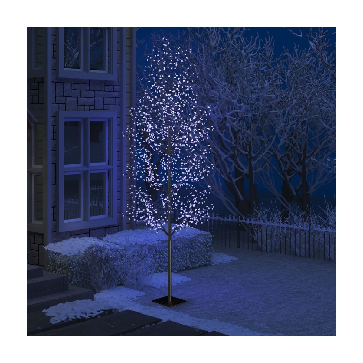 Nuestro árbol de Navidad artificial, con sus ramas salpicadas de hermosas flores de cerezo, crea un ambiente de vacaciones agradable. Este árbol se ilumina con LED de bajo consumo, que ilumina tu habitación con luz azul y también sirve como iluminación indirecta. Las flores de cerezo están hechas de material suave; por lo tanto, son flexibles y difíciles de romper. Las ramas se pueden ampliar por separado y la base metálica aporta estabilidad. La entrega también incluye un adaptador que tiene 8 funciones. Además, esta decoración navideña es perfectamente adecuada para uso tanto en interiores como en exteriores. Nota: Hay tres anillos en el maletero. Como el árbol es muy alto, ate la cuerda alrededor del anillo y fíjela al suelo para obtener apoyo adicional. La cuerda no está incluida en la entrega.
