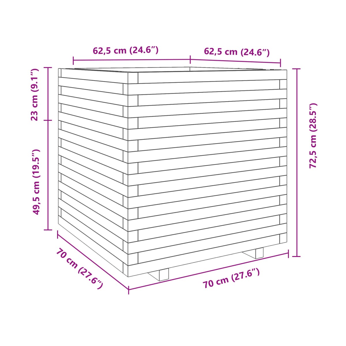 Esta jardinera es ideal para que los aficionados al bricolaje decoren jardines, balcones o patios. Madera impregnada: La madera maciza de pino es un bonito material natural. Tiene vetas rectas y los nudos dan al material su distintivo aspecto rústico. La impregnación es un proceso de conservación que se realiza mediante el uso de autoclaves. El tratamiento a presión aumenta la resistencia a la putrefacción y a la intemperie.Gran capacidad: La jardinera de exterior proporciona mucho espacio para cultivar todas tus verduras, flores y otras plantas.Función decorativa: Utiliza la jardinera de patio para crear tu propio pequeño jardín. Aportará un ambiente animado y será la decoración ideal para tu hogar.