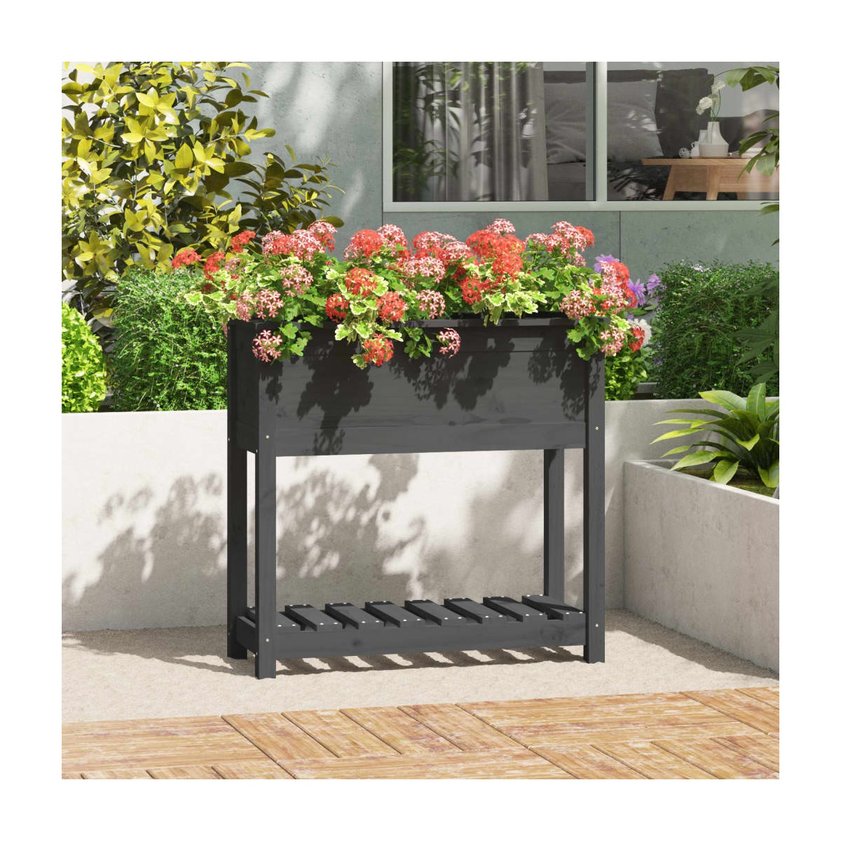 Esta jardinera de madera es una excelente opción para que los aficionados al bricolaje decoren sus salones, balcones o patios. Madera de pino maciza: La madera de pino maciza es un bonito material natural. La madera de pino tiene vetas rectas, y los nudos dan al material su distintivo aspecto rústico.Altura óptima: La jardinera, con una altura de trabajo ergonómica óptima, te permite estar de pie o sentado cómodamente frente a la jardinera y protege tus rodillas y espalda.Amplio espacio: Este macetero tiene una caja de flores profunda para plantar, que proporciona un amplio espacio de plantación para cultivar vegetales, hierbas, flores y plantas.Estante práctico: La jardinera está diseñada con un estante, lo que le permite almacenar tierra para macetas y accesorios para plantas al alcance de la mano.Marco estable: El marco de madera de la maceta de jardín garantiza robustez y estabilidad. Nota:Cada producto viene con un manual de montaje en la caja para facilitar el montaje.
