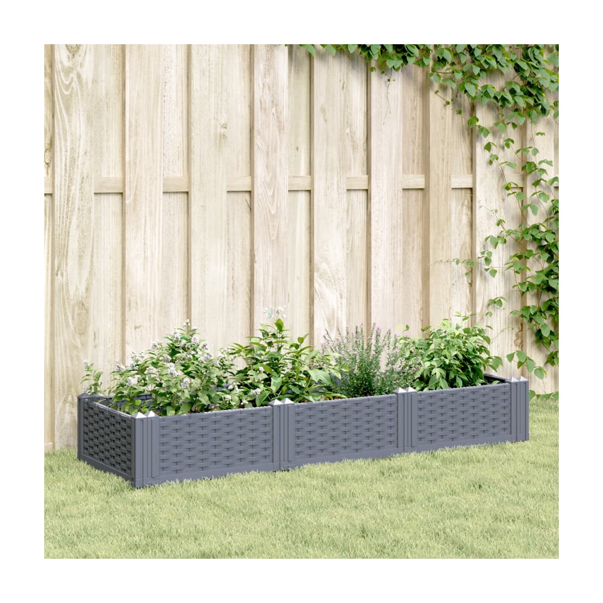 ¡Planta verduras, hierbas de cocina o flores decorativas en esta jardinera práctica y duradera! Material duradero: El polipropileno es un plástico popular y también es uno de los materiales más utilizados en muebles de exterior. Es ligero, duro y resistente a los impactos.Gran capacidad: La jardinera de exterior proporciona mucho espacio para cultivar todas tus verduras, flores y otras plantas.Diseño modular: Esta jardinera consta de 8 paneles que se pueden combinar libremente. Puedes cambiarla fácilmente de jardinera elevada a valla de jardín según tus necesidades.Bonito aspecto de ratán: La jardinera está diseñada con un aspecto de ratán, lo que aporta un encanto elegante a tu hogar.