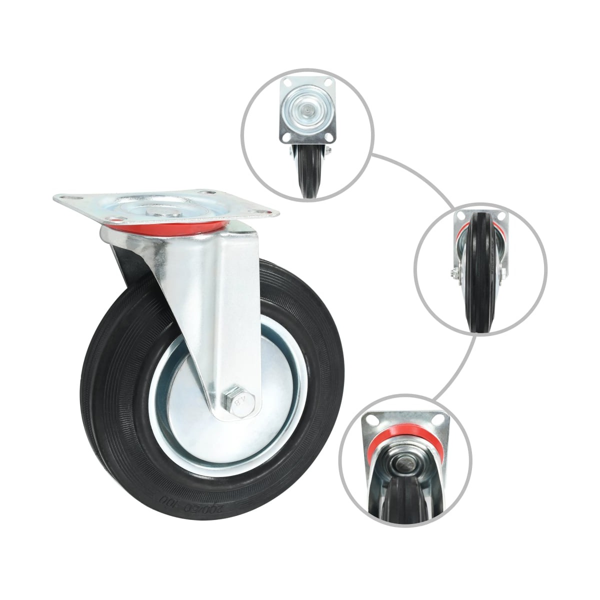 Este set de 8 ruedas giratorias será el accesorio ideal para pequeños equipamientos o muebles, como bancos de trabajo, trolleys, mesas de centro, maceteros, estanterías, carritos de la compra, etc. Las ruedas están hechas de goma, que se distingue por su buena capacidad de absorber impactos y por su resistencia a las vibraciones. Esto hace que las ruedas se desplacen suavemente y sin hacer ruido. Su superficie suave evita eficazmente que rallen el suelo. Y su estructura de hierro con recubrimiento de zinc es muy resistente a la oxidación y contribuye a su robustez y durabilidad. La mitad de estas ruedas giratorias incluyen frenos para un control más flexible. Cada una tiene una capacidad de carga máxima de hasta 180 kg. La entrega incluye 4 ruedas giratorias y 4 ruedas giratorias con frenos.
