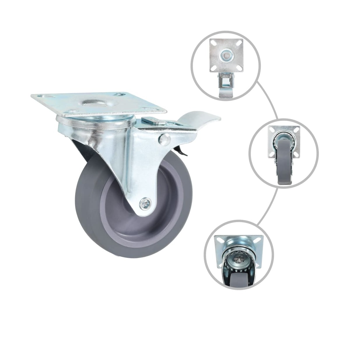 Este set de 12 ruedas giratorias, la mitad con frenos ,será el accesorio ideal para pequeños equipamientos o muebles, como como bancos de trabajo, trolleys, mesas de centro, maceteros, estanterías, carritos de la compra, etc. Las ruedas están hechas de TPR (goma termoplástica) que se distingue por su buena capacidad de absorber impactos y por su resistencia a las vibraciones. Eso hace que las ruedas giren suavemente y sin hacer ruido. Su superficie suave evita eficazmente que rallen el suelo. Y su estructura de hierro con recubrimiento de zinc es muy resistente a la oxidación y contribuye a su robustez y durabilidad. Estas ruedas giratorias incluyen frenos para un control más flexible. Cada rueda tiene una capacidad de carga máxima de hasta 45 kg. La entrega incluye 12 ruedas giratorias, la mitad con frenos.