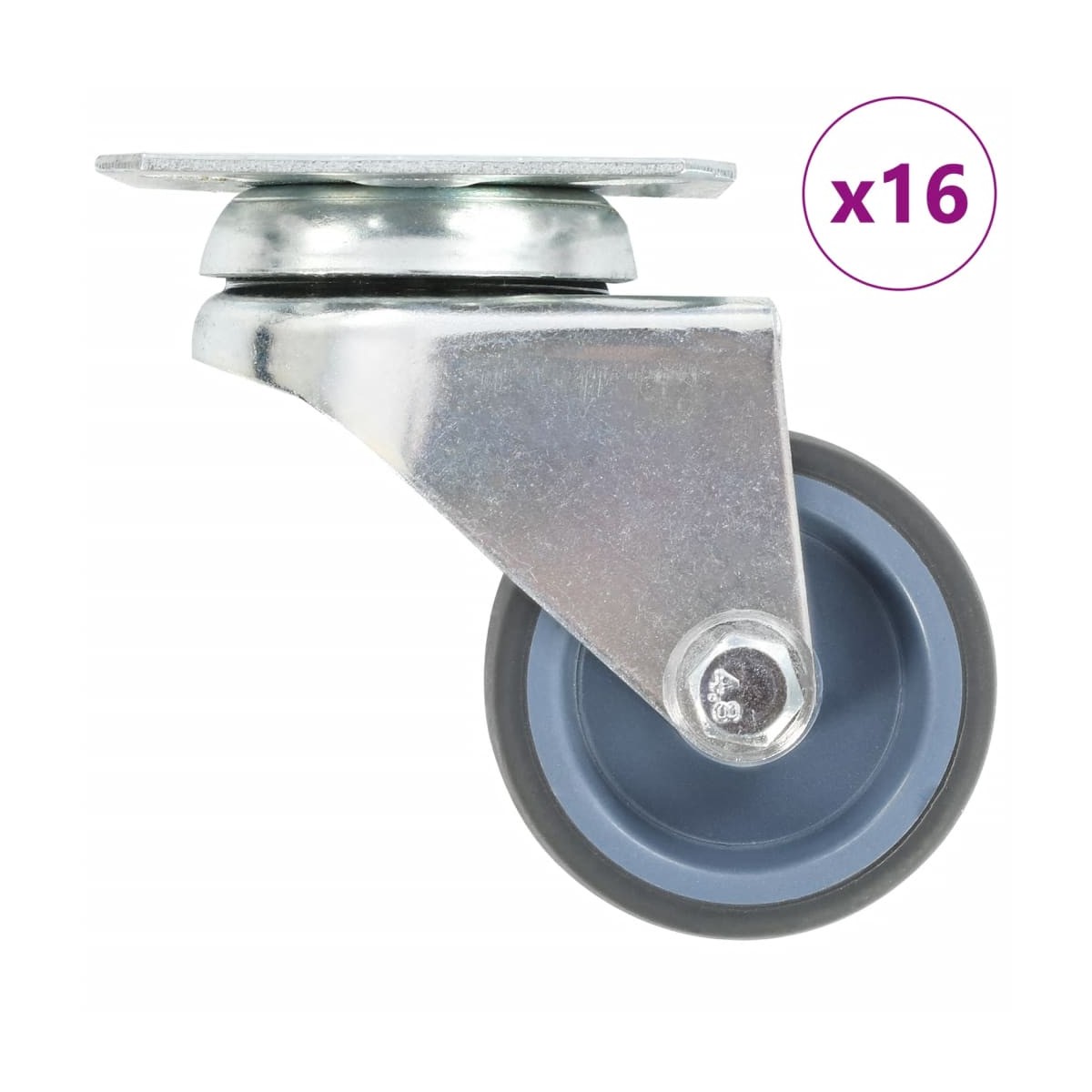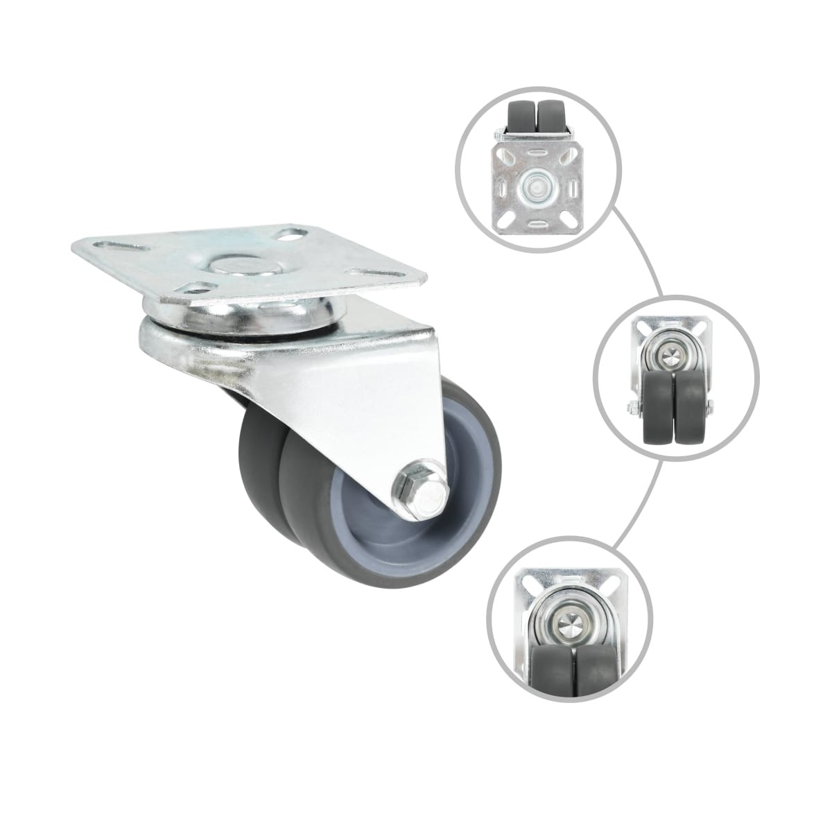 Este set de 16 ruedas dobles giratorias será el accesorio ideal para pequeños equipamientos o muebles, como bancos de trabajo, trolleys, mesas de centro, maceteros, estanterías, carritos de la compra, etc. Estas ruedas están hechas de TPR (caucho termoplástico) que se distingue por una buena resistencia a los golpes y vibraciones, lo que permite que estas ruedas funcionen de manera suave y silenciosa. Además, sus superficies suaves protegen eficazmente su suelo de los arañazos. Asimismo, la estructura de hierro con recubrimiento de zinc es muy resistente al óxido y por lo tanto aporta robustez y durabilidad a la rueda. Cada rueda tiene una capacidad de carga máxima de hasta 100 kg. La entrega incluye 16 ruedas giratorias.
