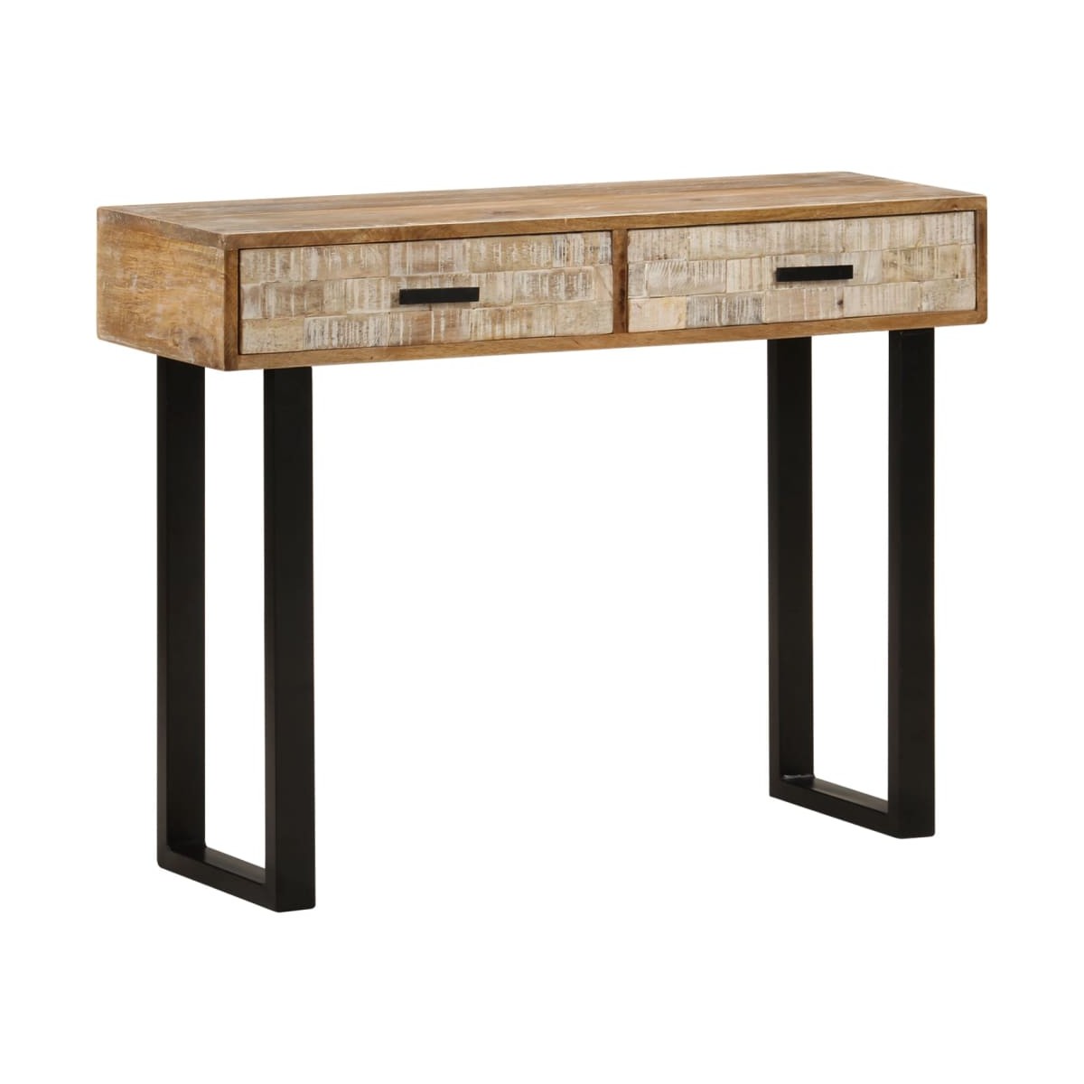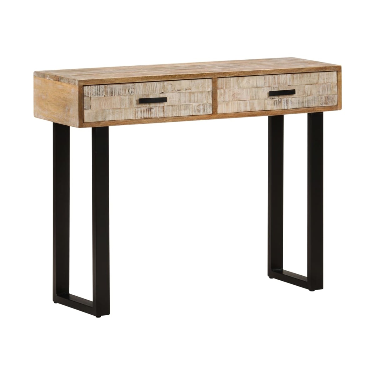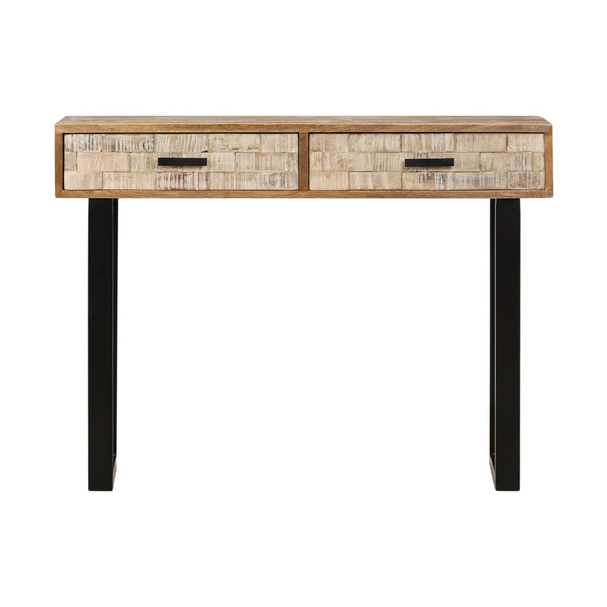 Esta mesa consola de madera de estilo industrial será un aporte distintivo para cualquier habitación. Su superficie de mango macizo proporciona un amplio espacio para colocar adornos, marcos de fotos, o incluso macetas. También se pueden poner objetos pequeños como llaves, blocs de notas, bolígrafos y otros adornos en sus dos cajones amplios. Las patas de hierro aportan robustez y un estilo industrial impresionante. La estructura de vetas visible hace que cada pieza de mobiliario sea única y ligeramente diferente del resto. Nota importante: Los colores varían de una pieza a otra, por lo que cada una de nuestras mesas consola sea única. La entrega es aleatoria, lo que garantiza la exclusividad e individualidad del producto.