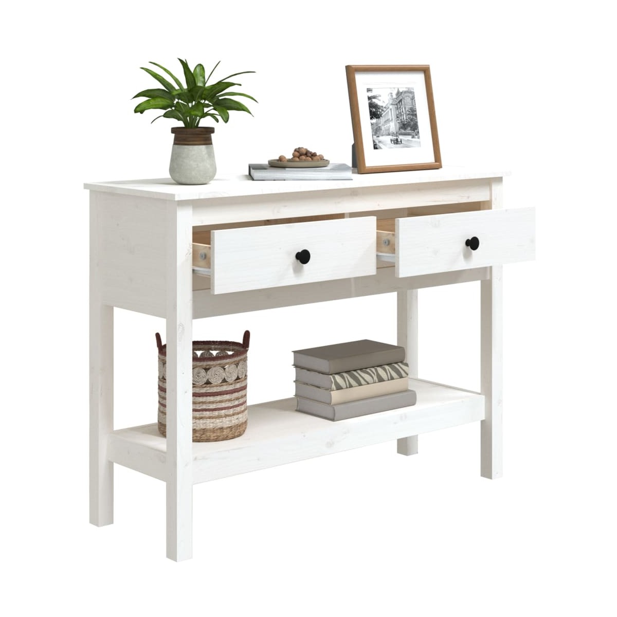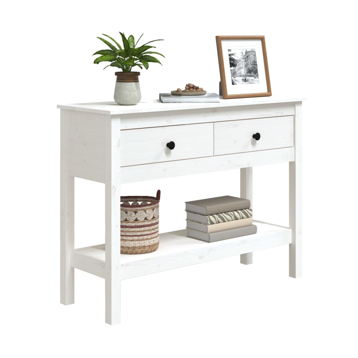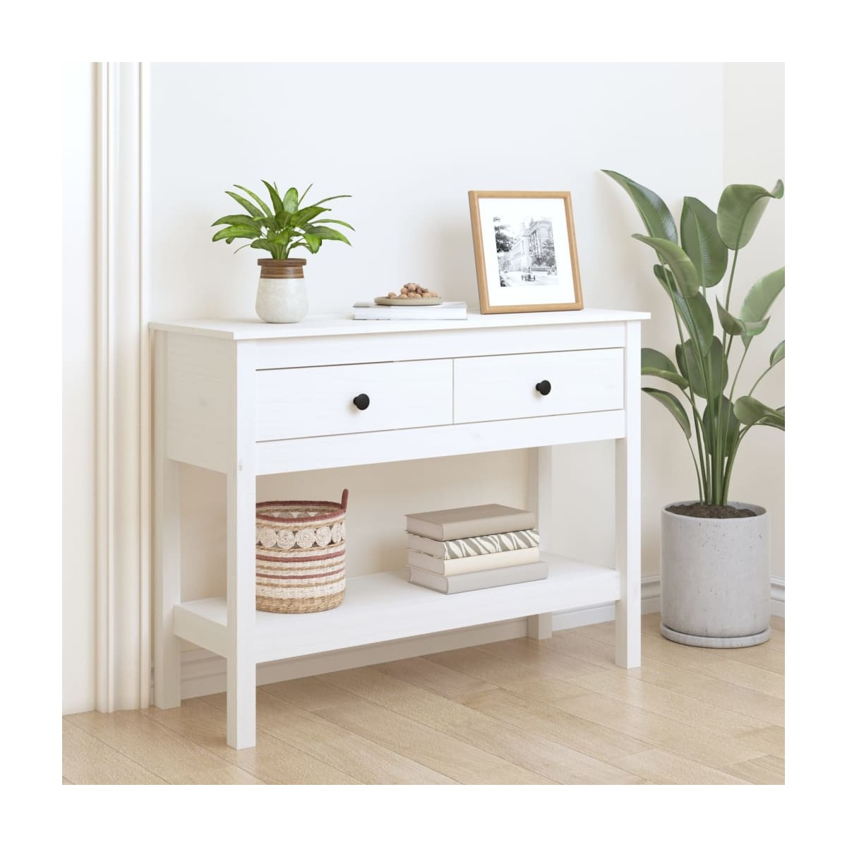 ¡Añade un bonito toque a la estancia con esta clásica mesa consola de madera! Es un complemento práctico y decorativo para la decoración de tu casa. Madera de pino maciza: La madera de pino maciza es un bonito material natural. La madera de pino tiene vetas rectas, y los nudos dan al material su distintivo aspecto rústico.Estructura estable: La estructura de madera garantiza su solidez y estabilidad.Amplio espacio de almacenaje: La mesita de entrada tiene 2 cajones y 1 estante abierto, lo que te proporciona espacio de almacenaje para que puedas tener todos los básicos del día a día organizados y al alcance.Superficie resistente: La superficie de esta mesita auxiliar es perfecta para exponer tus objetos decorativos favoritos, marcos de fotos y plantas.Múltiples usos: Esta mesita de sofá es adecuada para cualquier lugar de la casa. Se puede utilizar como mesita de entrada, mesita de sofá, mesita decorativa, mesa consola para TV, etc. Advertencia:Para evitar el vuelco, este producto debe usarse con el dispositivo provisto para fijarlo a la pared. Nota:Cada producto viene con un manual de montaje en la caja para facilitar el montaje.