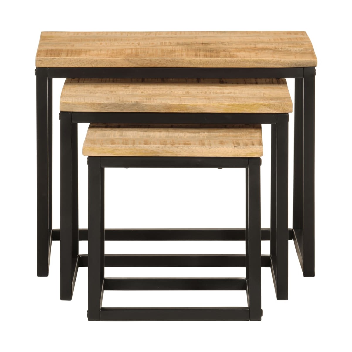 Estas 3 mesas de centro apilables son la alternativa perfecta para pisos pequeños o cualquier zona con espacio limitado. Material duradero: La madera maciza de mango es una madera tropical, dura y resistente, que sirve para hacer muebles robustos. Las bonitas vetas de la madera hacen que cada mueble sea ligeramente diferente al resto. Diseño apilable: Las mesas apilables tienen diferentes tamaños para cumplir con tus diferentes requisitos. La mesa más pequeña puede anidarse dentro de la mesa de centro más grande si necesitas más espacio. Y puedes organizarlas por separado para obtener el máximo espacio en la mesa. Función versátil: ¡Las mesas auxiliares apilables son versátiles! Cualquiera de ellas se puede utilizar como mesita de noche en el dormitorio, mesa auxiliar o mesa de sofá en el salón y la oficina. Superficie resistente: La resistente superficie de las mesas apilables es ideal para dejar las bebidas o cualquier otra cosa que necesites tener al alcance de la mano. Información útil:Cada artículo es único, con variaciones de color y veta. La entrega es aleatoria garantizando la exclusividad y la individualidad del producto.