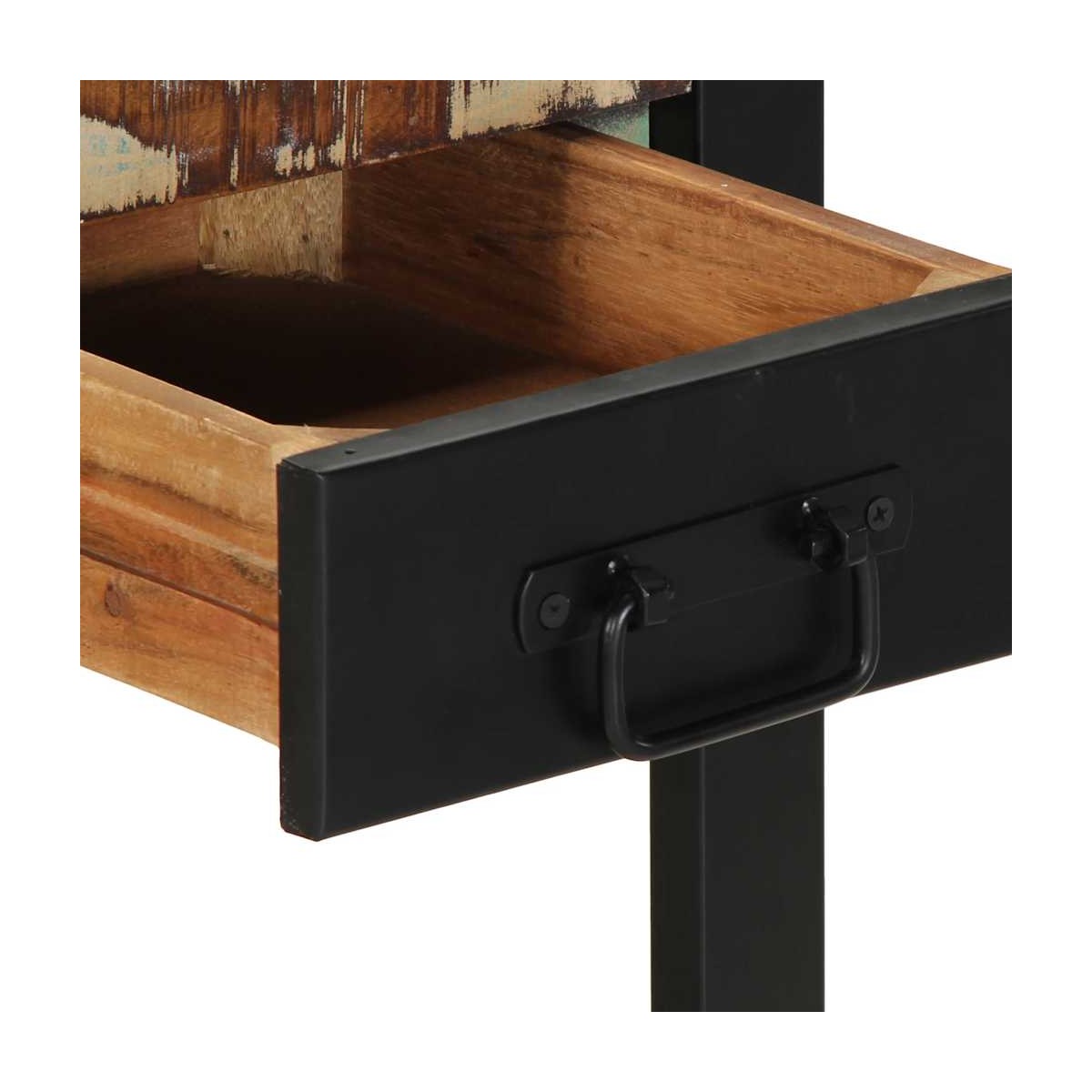 Esta mesa auxiliar está diseñada para ser el foco de atención en tu habitación con un diseño moderno y práctico. Material robusto y estable: la madera maciza reciclada consta de maderas reutilizadas como la teca, la madera de mango, la madera de pino y el haya. Dichos materiales proceden de antiguas construcciones como fábricas, cobertizos y barcos. Los signos de desgaste y la estructura visible de la veta dan a cada pieza su propia historia y un aspecto único.Amplio espacio de almacenamiento: la mesa del recibidor tiene 1 cajón y 1 estante abierto, lo que proporciona suficiente espacio de almacenamiento para mantener varios elementos esenciales diarios organizados y al alcance de la mano.Tablero resistente: el tablero resistente de la mesa auxiliar es perfecto para colocar fotografías enmarcadas, plantas en macetas y otros elementos decorativos.Amplias aplicaciones: esta versátil mesa auxiliar puede servir como mesa auxiliar junto al sofá, mesita de noche, rincón de lectura, estación de té o aperitivos, plataforma de exposición o incluso como espacio de trabajo para ordenador portátil. Es perfecta para añadir funcionalidad a diversos espacios, como baños, pasillos, salas de estar, dormitorios, oficinas y mucho más. Información útil:Cada artículo es único, con variaciones de color y veta. La entrega es aleatoria garantizando la exclusividad y la individualidad del producto. Advertencia:Para evitar que vuelque, este producto debe usarse con el dispositivo de fijación a la pared suministrado.