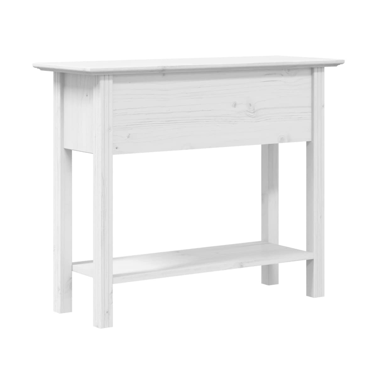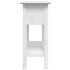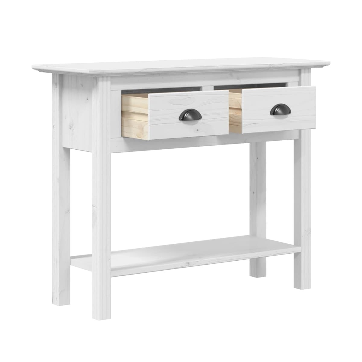 Esta clásica mesa consola será un complemento práctico y decorativo para la decoración de tu hogar. Madera maciza de pino: La madera maciza de pino es un hermoso material natural. La madera de pino tiene vetas rectas, y los nudos dan al material su característico aspecto rústico. Fabricada en madera maciza de pino, la mesita de sofá es robusta y estable.Amplio espacio de almacenaje: Esta práctica mesa de recibidor dispone de 2 cajones y un estante inferior, por lo que proporciona un amplio espacio para guardar libros, plantas, cajas de almacenaje, adornos, etc.Función expositora: También puedes colocar tus fotos favoritas, adornos o flores en la superficie de esta mesita auxiliar para alegrarte la vida.Tiradores de metal: Los tiradores metálicos de la mesa auxiliar facilitan la apertura y el cierre de los cajones y hacen que el mueble de recibidor resulte más bonito.Encantador estilo francés: ¡Añade un inspirador estilo francés a la decoración de la casa! Advertencia:Para evitar que vuelque, este producto debe usarse con el dispositivo de fijación a la pared incluido.