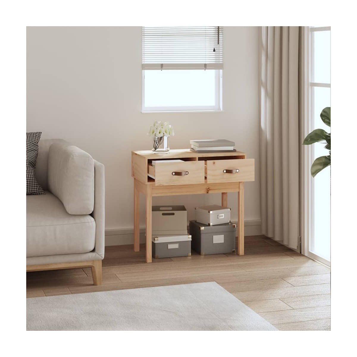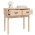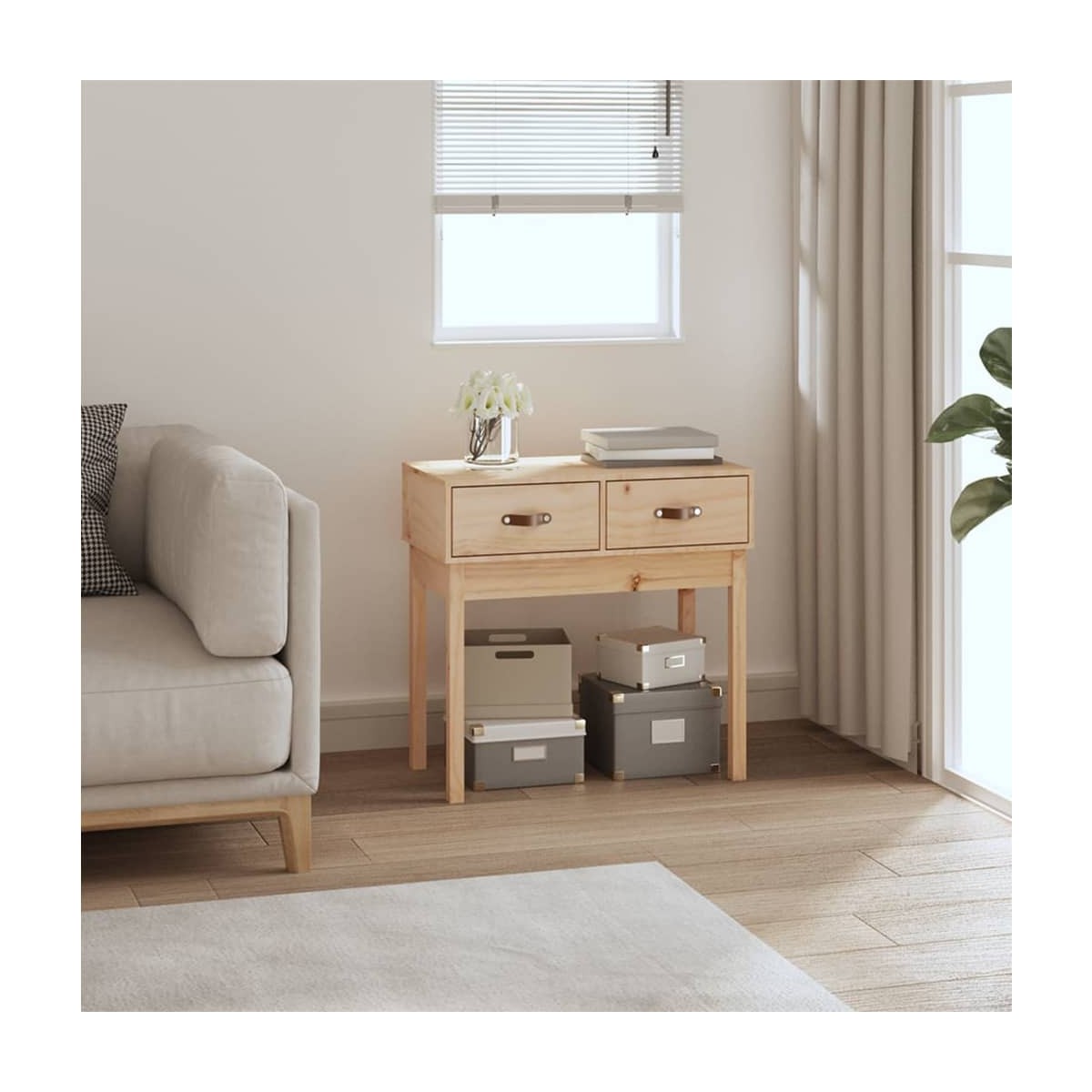 ¡Esta mesa consola de madera es un aporte perfecto para el dormitorio, el salón o la oficina, ya que crea una impresión duradera! Madera maciza de pino: Esta mesa está hecha de madera maciza de pino, un bonito material natural. La madera de pino tiene vetas rectas, y los nudos dan al material su distintivo aspecto rústico.Amplio almacenamiento: La mesa de pasillo tiene 2 cajones, lo que proporciona suficiente espacio de almacenaje para que puedas tener todos los básicos del día a día organizados y al alcance.Función expositora: La superficie de esta mesa auxiliar es perfecta para exponer tus objetos decorativos favoritos, marcos de fotos y plantas.Múltiples usos: Esta mesita de sofá es adecuada para cualquier lugar de la casa. Se puede utilizar como mesita de entrada, mesita de sofá, mesita decorativa, mesa consola para TV, etc. Advertencia:Para evitar el vuelco, este producto debe usarse con el dispositivo provisto para fijarlo a la pared. Nota:Cada producto viene con un manual de montaje en la caja para facilitar el montaje.