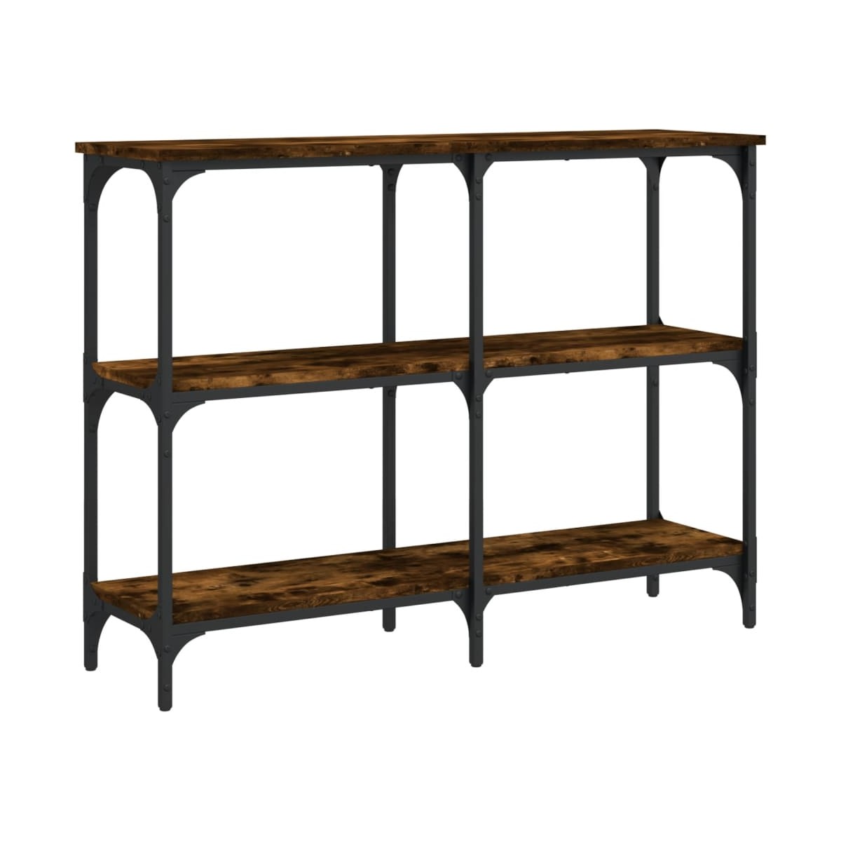 Añade un toque de elegancia a la entrada, el salón o el pasillo con esta elegante mesa consola. Material duradero: La madera de ingeniería tiene una calidad excepcional, con una superficie lisa, y también se caracteriza por su fuerza, estabilidad y resistencia a la humedad. Hecha de madera de ingeniería, la mesita de sofá es fácil de limpiar.Amplio espacio de almacenaje: La mesa de recibidor ofrece un amplio espacio de almacenaje para mantener bien organizados y al alcance revistas, libros, artículos decorativos y otros objetos de uso diario.Patas ajustables: La seis patas regulables, con tacos de plástico, mantienen equilibrada la mesa de pasillo en terrenos irregulares y aumentan su estabilidad.Estructura metálica: La estructura metálica añade un estilo industrial a la casa, además de garantizar su durabilidad y estabilidad. Advertencia:Para evitar que vuelque, este producto debe usarse con el dispositivo de fijación a la pared incluido.