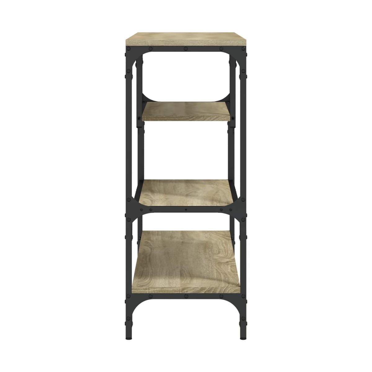 Añade un toque de elegancia a la entrada, el salón o el pasillo con esta elegante mesa consola. Material duradero: La madera de ingeniería tiene una calidad excepcional, con una superficie lisa, y también se caracteriza por su fuerza, estabilidad y resistencia a la humedad. Hecha de madera de ingeniería, la mesita de sofá es fácil de limpiar.Amplio espacio de almacenaje: La mesa de recibidor con varios estantes ofrece un amplio espacio de almacenaje para mantener bien organizados y al alcance revistas, libros, artículos decorativos y otros objetos de uso diario.Patas ajustables: Las patas ajustables con almohadillas de plástico mantienen el equilibrio de la mesa sobre terrenos irregulares y aumentan su estabilidad.Estructura metálica: La estructura metálica añade un estilo industrial a la casa, además de garantizar su durabilidad y estabilidad. Advertencia:Para evitar que vuelque, este producto debe usarse con el dispositivo de fijación a la pared incluido.