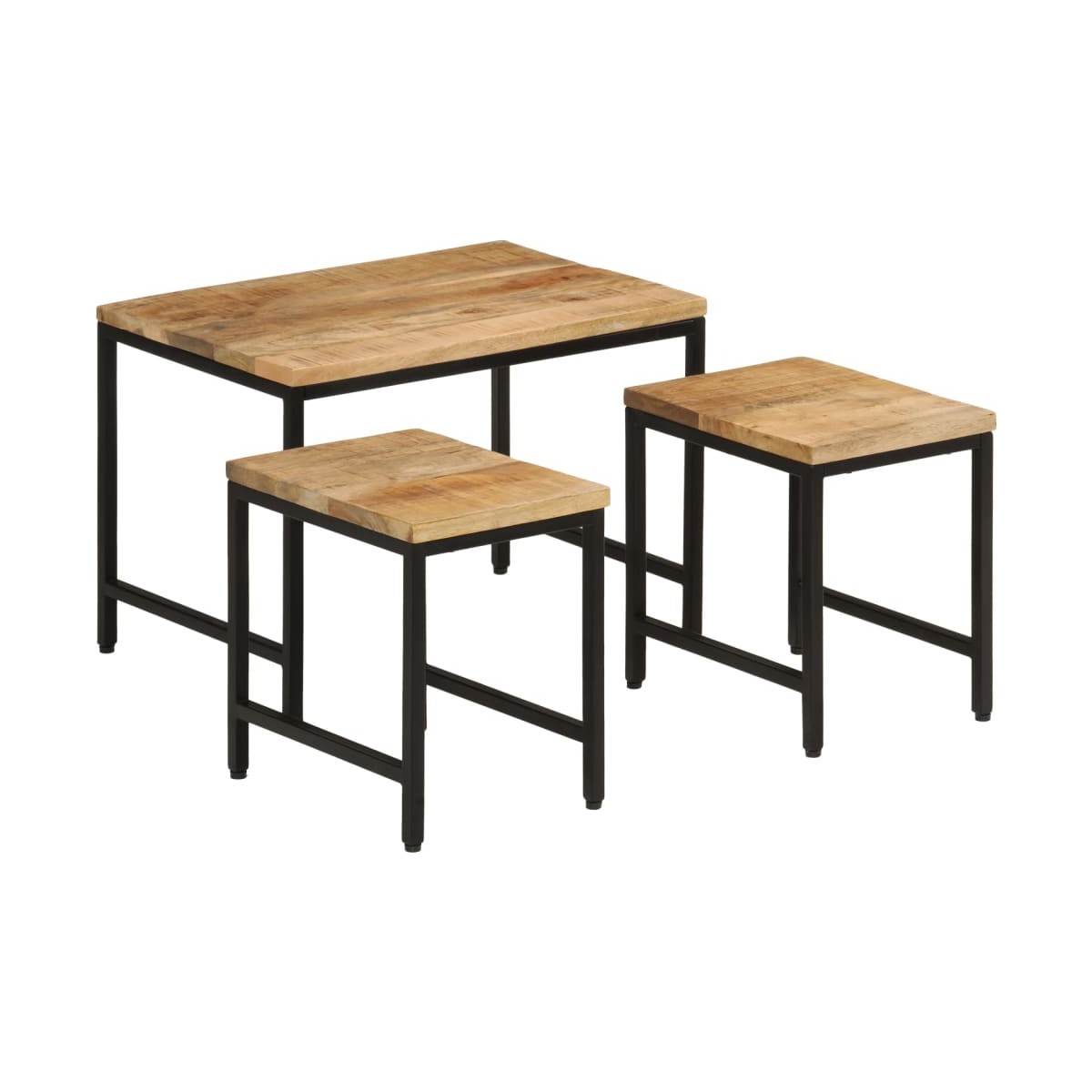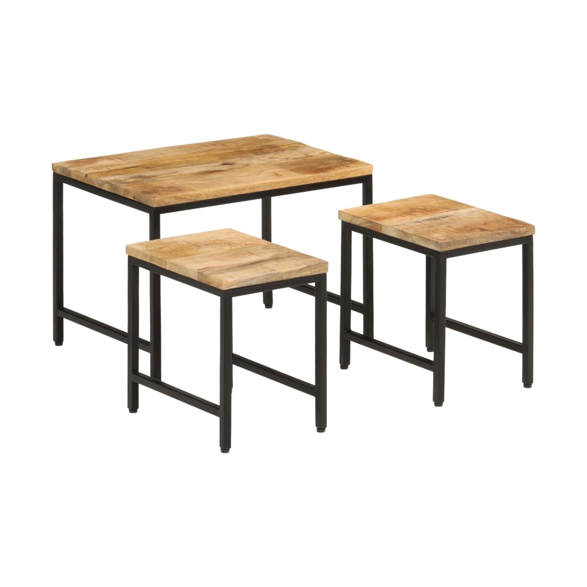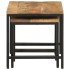 Estas 3 mesas de centro apilables son la alternativa perfecta para pisos pequeños o cualquier zona con espacio limitado. Material duradero: La madera maciza de mango es una madera tropical, dura y resistente, que sirve para hacer muebles robustos. Las bonitas vetas de la madera hacen que cada mueble sea ligeramente diferente al resto. Diseño apilable: Las mesas apilables tienen diferentes tamaños para cumplir con tus diferentes requisitos. La mesa más pequeña puede anidarse dentro de la mesa de centro más grande si necesitas más espacio. Y puedes organizarlas por separado para obtener el máximo espacio en la mesa. Función versátil: ¡Las mesas auxiliares apilables son versátiles! Cualquiera de ellas se puede utilizar como mesita de noche en el dormitorio, mesa auxiliar o mesa de sofá en el salón y la oficina. Superficie resistente: La resistente superficie de las mesas apilables es ideal para dejar las bebidas o cualquier otra cosa que necesites tener al alcance de la mano. Información útil:Cada artículo es único, con variaciones de color y veta. La entrega es aleatoria garantizando la exclusividad y la individualidad del producto.