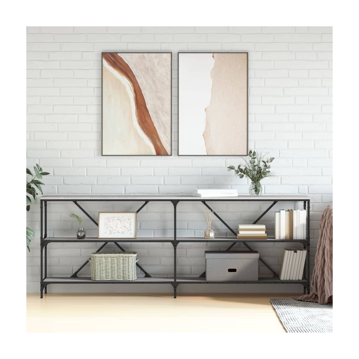 Añade un toque de elegancia a la entrada, el salón o el pasillo con esta elegante mesa consola. Material duradero: La mesa de recibidor está hecha de madera de ingeniería. La madera de ingeniería tiene una calidad excepcional, con una superficie lisa, y también es fuerte, estable y resistente a la humedad. Estructura robusta: La estructura de hierro garantiza su solidez y estabilidad. El respaldo tiene travesaños dobles en forma de X para lograr una mayor estabilidad, por lo que no tienes que preocuparte de que se tambalee sobre el suelo.Amplio espacio de almacenaje: La mesita de sofá ofrece un amplio espacio de almacenaje para mantener tus cosas bien organizadas y al alcance. Superficie resistente: La robusta superficie de la mesa de pasillo es perfecta para colocar marcos de fotos, plantas y otros objetos decorativos.Patas ajustables: Las cuatro patas ajustables con almohadillas de plástico mantienen el equilibrio de la mesa auxiliar sobre suelos irregulares y aumentan la estabilidad. Advertencia:Para evitar que vuelque, este producto debe usarse con el dispositivo de fijación a la pared incluido.