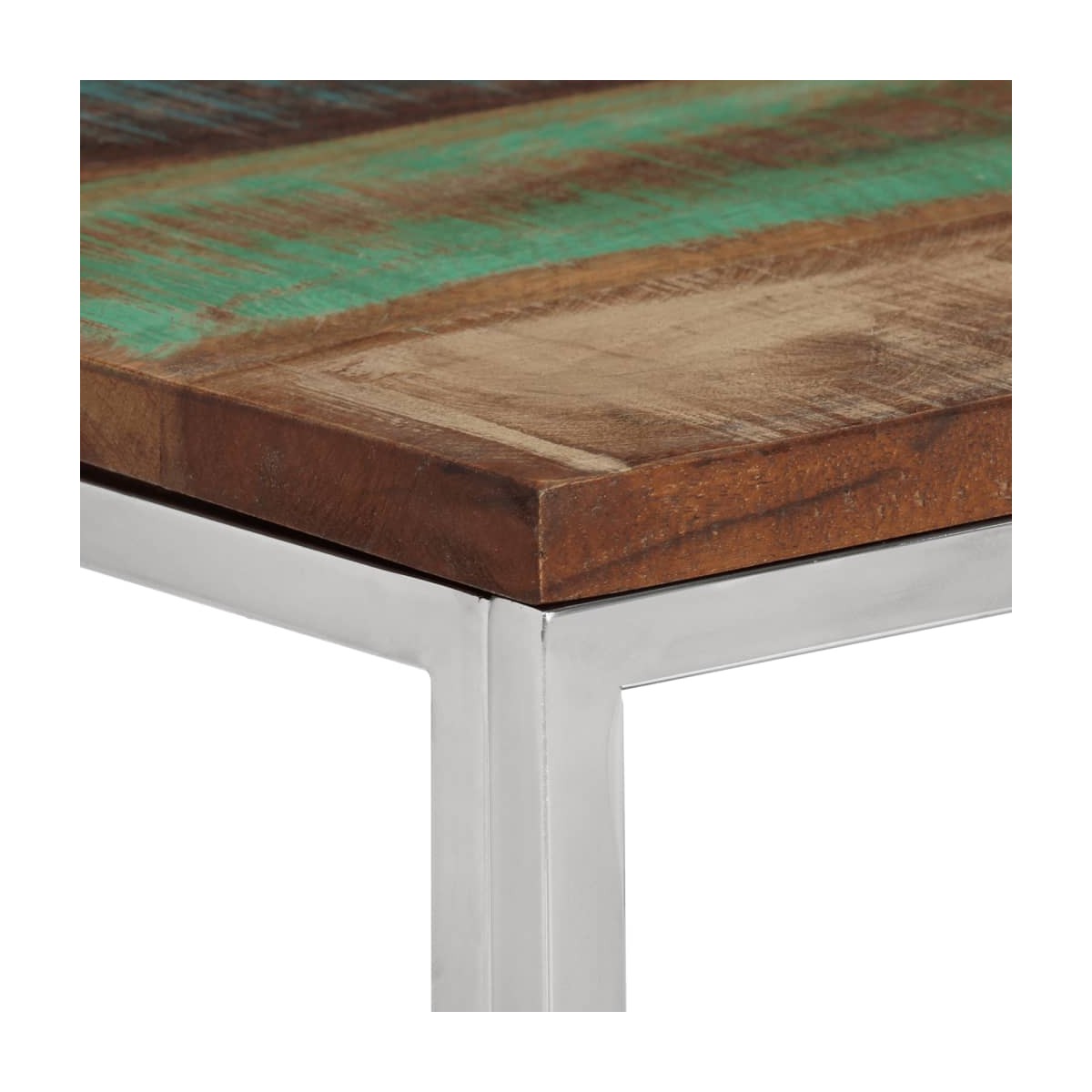 Funcional y bonita, esta mesa consola se convertirá en el centro de atención de tla estancia. Superficie de madera maciza reciclada: La madera maciza reciclada consta de distintas maderas reutilizadas como la teca, la madera de mango, de pino y de haya. Dichos materiales proceden de antiguas construcciones como fábricas, cobertizos y barcos. Como cada pieza está hecha a mano, los colores variarán en cada producto. La parte superior de la mesa del sofá proporciona una superficie amplia y segura para colocar jarrones, plantas en macetas u otros elementos decorativos.Estructura robusta y estable: La estructura de acero inoxidable de la mesa del salón garantiza robustez y estabilidad.Fácil mantenimiento: Esta mesa de pasillo con superficie resistente a las manchas es fácil de limpiar y podrás mantener la mesa en su mejor aspecto sin esfuerzo.Diseño moderno: La mesa de pasillo tiene un diseño sencillo y moderno que complementa la decoración de cualquier habitación. Información útil:Los colores y las vetas varían en cada artículo, por lo que cada pieza es única. La entrega es aleatoria, asegurando la exclusividad e individualidad del producto.