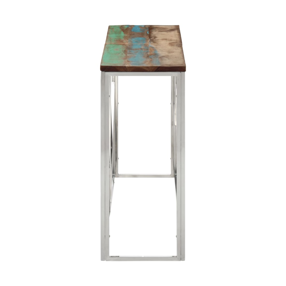 Funcional y bonita, esta mesa consola se convertirá en el centro de atención de tla estancia. Superficie de madera maciza reciclada: La madera maciza reciclada consta de distintas maderas reutilizadas como la teca, la madera de mango, de pino y de haya. Dichos materiales proceden de antiguas construcciones como fábricas, cobertizos y barcos. Como cada pieza está hecha a mano, los colores variarán en cada producto. La parte superior de la mesa del sofá proporciona una superficie amplia y segura para colocar jarrones, plantas en macetas u otros elementos decorativos.Estructura robusta y estable: La estructura de acero inoxidable de la mesa del salón garantiza robustez y estabilidad.Fácil mantenimiento: Esta mesa de pasillo con superficie resistente a las manchas es fácil de limpiar y podrás mantener la mesa en su mejor aspecto sin esfuerzo.Diseño moderno: La mesa de pasillo tiene un diseño sencillo y moderno que complementa la decoración de cualquier habitación. Información útil:Los colores y las vetas varían en cada artículo, por lo que cada pieza es única. La entrega es aleatoria, asegurando la exclusividad e individualidad del producto.