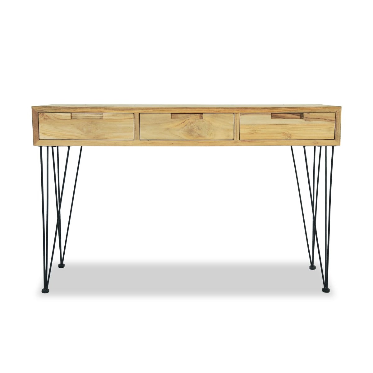 Esta mesa consola de estilo colonial, hecha de madera de teca maciza reciclada, agregará un toque de encanto rústico a su hogar. También se puede usar como mesa auxiliar, escritorio o aparador. La mesa tiene una superficie de madera maciza, en la que puede colocar elementos decorativos, como cestas de frutas o jarrones. Los 3 cajones ofrecen un amplio espacio para colocar todo tipo de artículos pequeños organizados y al alcance. Esta robusta mesa auxiliar está apoyada por fuertes patas de hierro forjado. El montaje es realmente fácil. Nota importante: Los colores y las vetas de la madera varían de una pieza a otra, lo que hace que cada una de nuestras mesas consolas sea única; la entrega es aleatoria