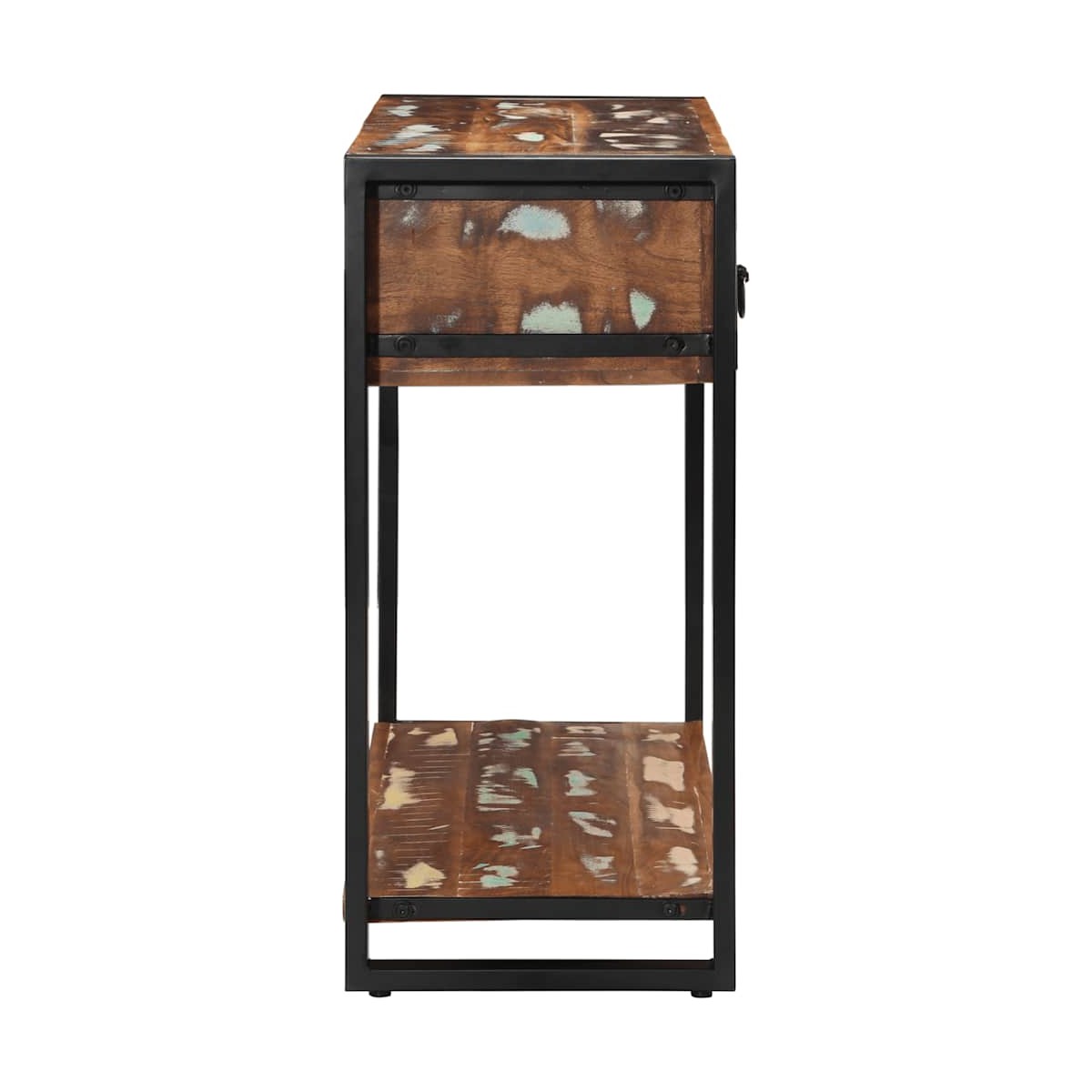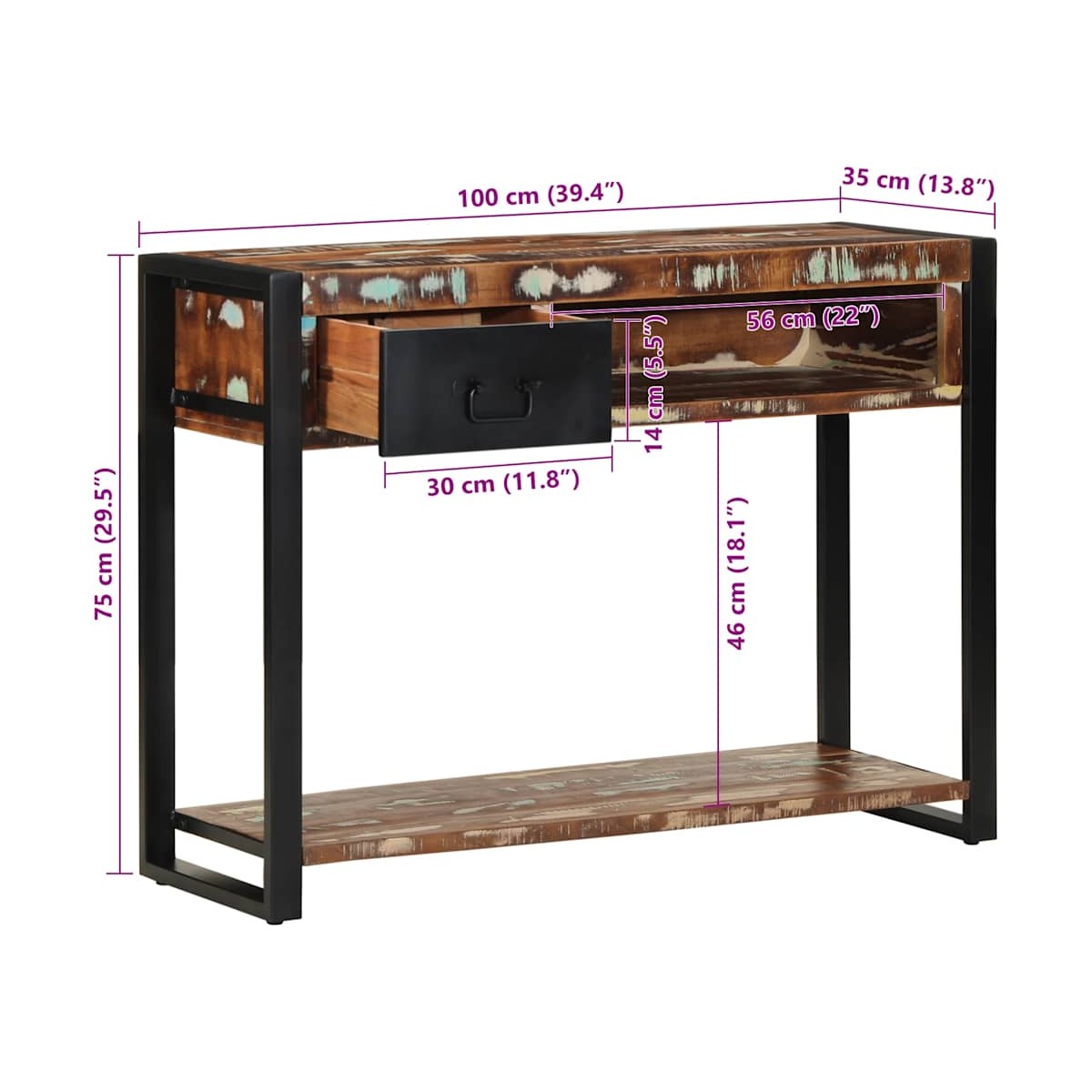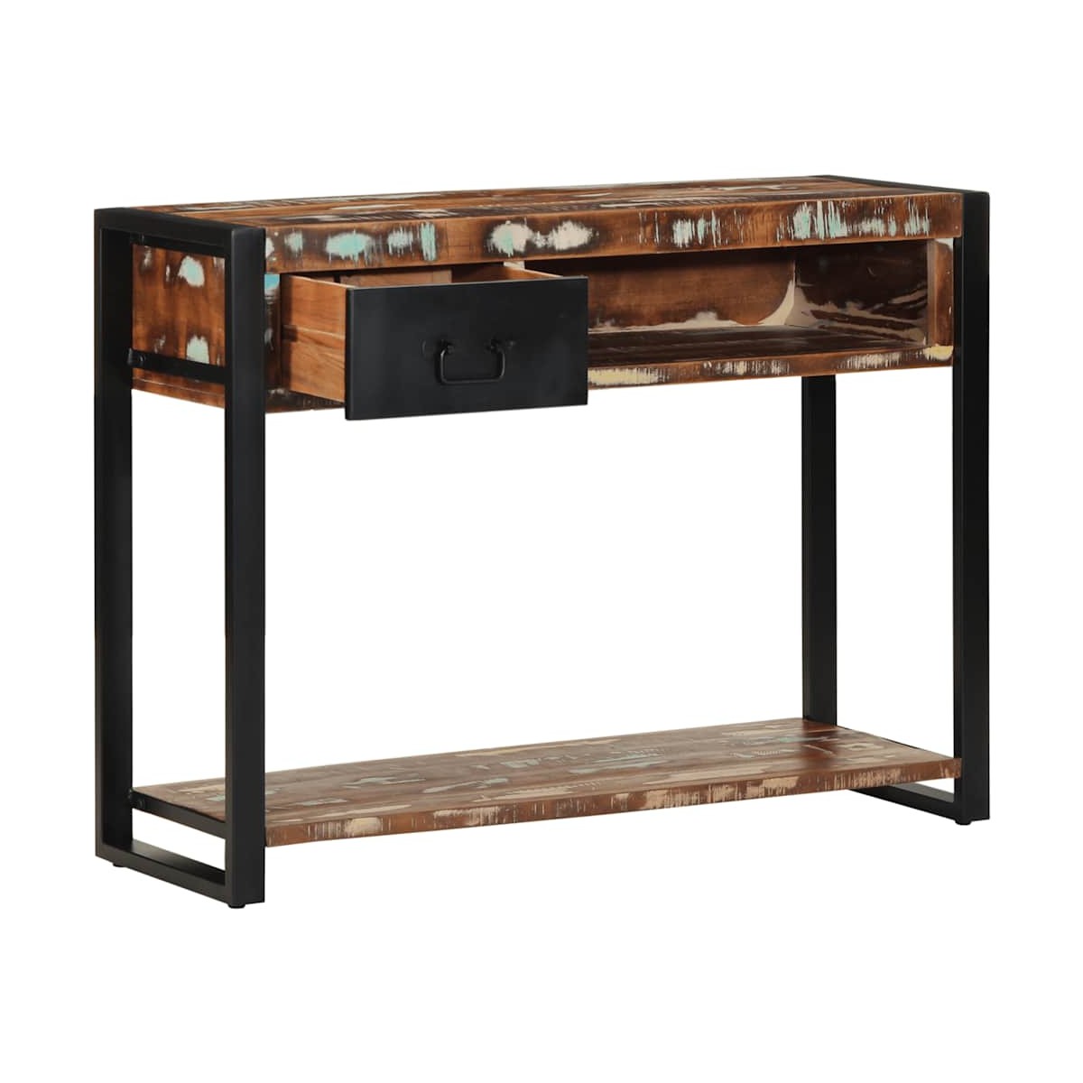 Esta mesa consola ofrece un amplio espacio de almacenamiento a la vez que complementa la decoración de su hogar. Es perfecta para el salón, el dormitorio y los pasillos. Material robusto y estable: la madera maciza reciclada consta de maderas reutilizadas como la teca, la madera de mango, la madera de pino y el haya. Dichos materiales proceden de antiguas construcciones como fábricas, cobertizos y barcos. Los signos de desgaste y la estructura visible de la veta dan a cada pieza su propia historia y un aspecto único.Amplio espacio de almacenamiento: esta mesa de recibidor tiene 1 cajón para brindar espacio de almacenamiento para mantener sus revistas, libros, controles remotos y otros artículos pequeños a su alcance.Tablero práctico: el tablero resistente de la mesa de sofá es perfecto para colocar marcos de fotos, bebidas, revistas y otros elementos decorativos.Uso versátil: la mesa de recibidor ofrece una funcionalidad práctica, ya sea como organizador de entrada, superficie de exposición para la decoración o espacio de trabajo en un pasillo o sala de estar. Su estructura robusta y su diseño rústico la hacen perfecta para diferentes espacios, combinando practicidad con encanto natural.Mango práctico: el mango de la mesa de entrada proporciona un agarre cómodo, lo que le ayuda a abrir y cerrar el gabinete fácilmente y al mismo tiempo agrega belleza adicional. Información útil:Cada artículo es único, con variaciones de color y veta. La entrega es aleatoria garantizando la exclusividad y la individualidad del producto. Advertencia:Para evitar que vuelque, este producto debe usarse con el dispositivo de fijación a la pared suministrado.