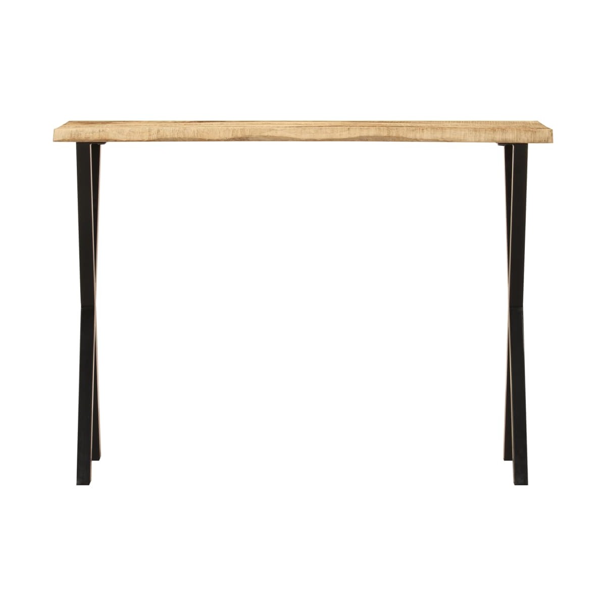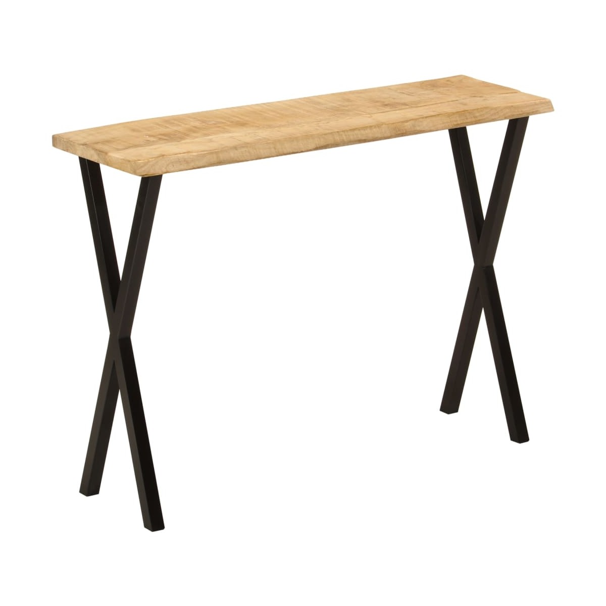 Esta mesa consola, con superficie de madera maciza de mango y patas estables en forma de X, es un complemento perfecto para tu salón o pasillo. Madera maciza de mango: El tablero está hecho de madera maciza de mango. La madera maciza de mango es una madera tropical, dura y resistente, que sirve para hacer muebles robustos. Las bonitas vetas de la madera hacen que cada mueble sea ligeramente diferente al resto.Borde vivo: El borde vivo de la madera que sigue la forma natural del árbol refuerza la belleza de la mesa.Estructura estable: Las patas de acero con recubrimiento en polvo en forma de X añaden un estilo industrial a tu decoración al mismo tiempo que garantizan la estabilidad de la mesa auxiliar.Función de visualización: La robusta superficie es ideal para exhibir objetos decorativos, marcos de fotos o plantas en macetas. Información útil:Cada artículo es único, con variaciones de color y veta. La entrega es aleatoria garantizando la exclusividad y la individualidad del producto.